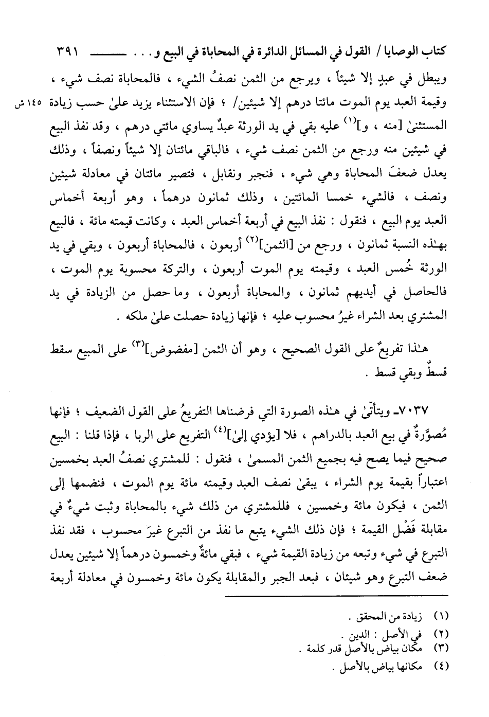 7037 - ويتأتّى في هذه الصورة التي فرضناها التفريعُ على القول الضعيف؛ فإنها مُصوَّرةٌ في بيع العبد بالدراهم، فلا [يؤدي إلى] (4) التفريع على الربا، فإذا قلنا: البيع صحيح فيما يصح فيه بجميع الثمن المسمى، فنقول: للمشتري نصفُ العبد بخمسين اعتباراً بقيمة يوم الشراء، يبقى نصف العبد وقيمته مائة يوم الموت، فنضمها إلى الثمن، فيكون مائة وخمسين، فللمشتري من ذلك شيء بالمحاباة وثبت شيءٌ في مقابلة فَضْل القيمة؛ فإن ذلك الشيء يتبع ما نفذ من التبرع غيرَ محسوب، فقد نفذ التبرع في شيء وتبعه من زيادة القيمة شيء، فبقي مائةٌ وخمسون درهماً إلا شيئين يعدل ضعف التبرع وهو شيئان، فبعد الجبر والمقابلة يكون مائة وخمسون في معادلة أربعة