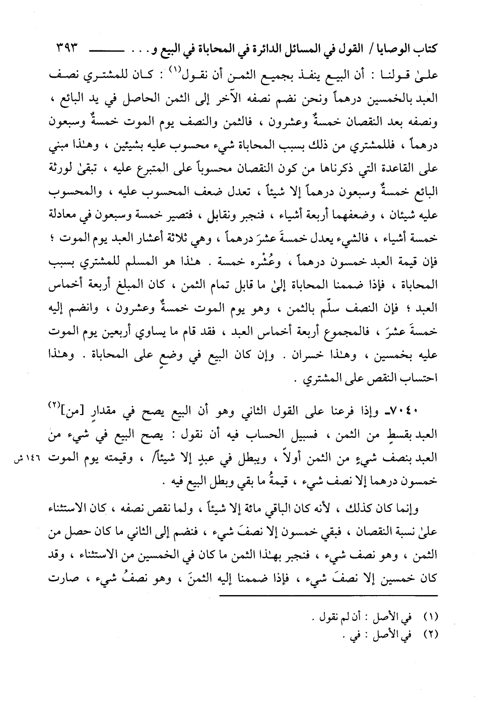 7040 - وإذا فرعنا على القول الثاني وهو أن البيع يصح في مقدارٍ [من] (2) العبد بقسطٍ من الثمن، فسبيل الحساب فيه أن نقول: يصح البيع في شيء من العبد بنصف شي؛ من الثمن أولاً، ويبطل في عبدٍ إلا شيئاً، وقيمته يوم الموت خمسون درهماً إلا نصف شيء، قيمةُ ما بقي وبطل البيع فيه.