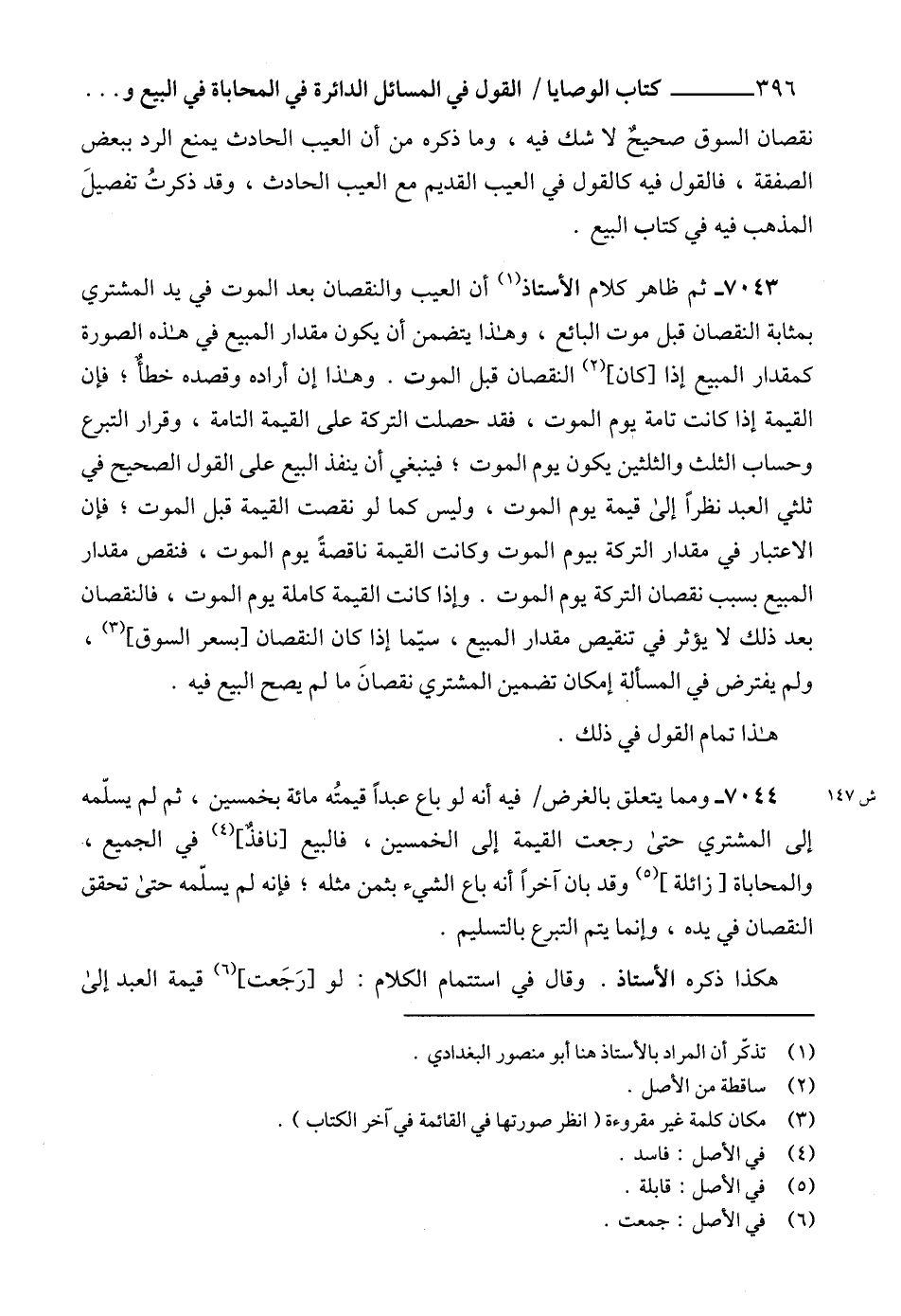 7043 - ثم ظاهر كلام الأستاذ (1) أن العيب والنقصان بعد الموت في يد المشتري بمثابة النقصان قبل موت البائع، وهذا يتضمن أن يكون مقدار المبيع في هذه الصورة كمقدار المبيع إذا [كان] (2) النقصان قبل الموت. وهذا إن أراده وقصده خطأٌ؛ فإن القيمة إذا كانت تامة يوم الموت، فقد حصلت التركة على القيمة التامة، وقرار التبرع وحساب الثلث والثلثين يكون يوم الموت؛ فينبغي أن ينفذ البيع على القول الصحيح في ثلثي العبد نظراً إلى قيمة يوم الموت، وليس كما لو نقصت القيمة قبل الموت؛ فإن الاعتبار في مقدار التركة بيوم الموت وكانت القيمة ناقصةً يوم الموت، فنقص مقدار المبيع بسبب نقصان التركة يوم الموت. وإذا كانت القيمة كاملة يوم الموت، فالنقصان بعد ذلك لا يؤثر في تنقيص مقدار المبيع، سيّما إذا كان النقصان [بسعر السوق] (3)، ولم يفترض في المسألة إمكان تضمين المشتري نقصانَ ما لم يصح البيع فيه.