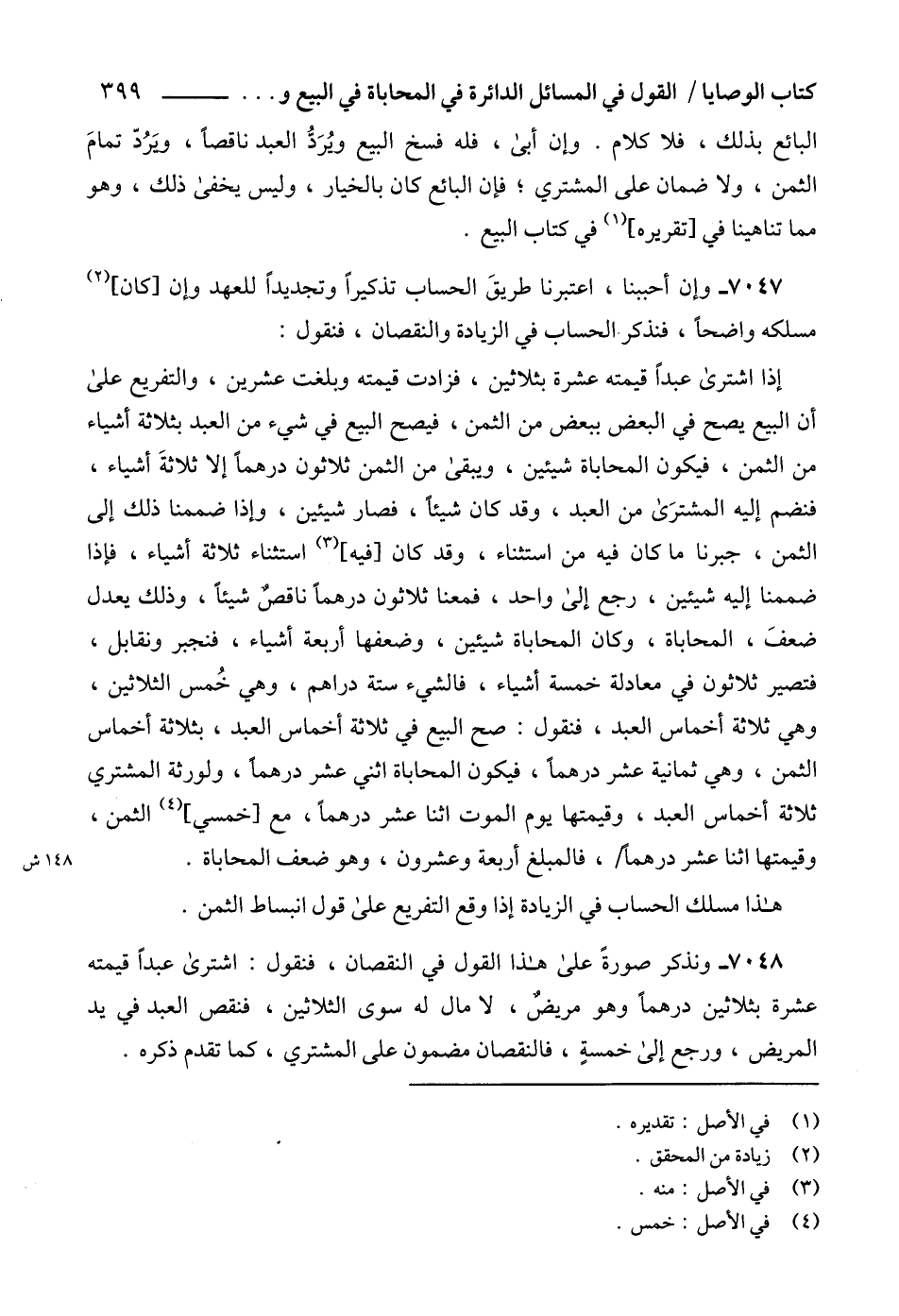 7047 - وإن أحببنا، اعتبرنا طريقَ الحساب تذكيراً وتجديداً للعهد وإن [كان] (2) مسلكه واضحاً، فنذكر الحساب في الزيادة والنقصان، فنقول: