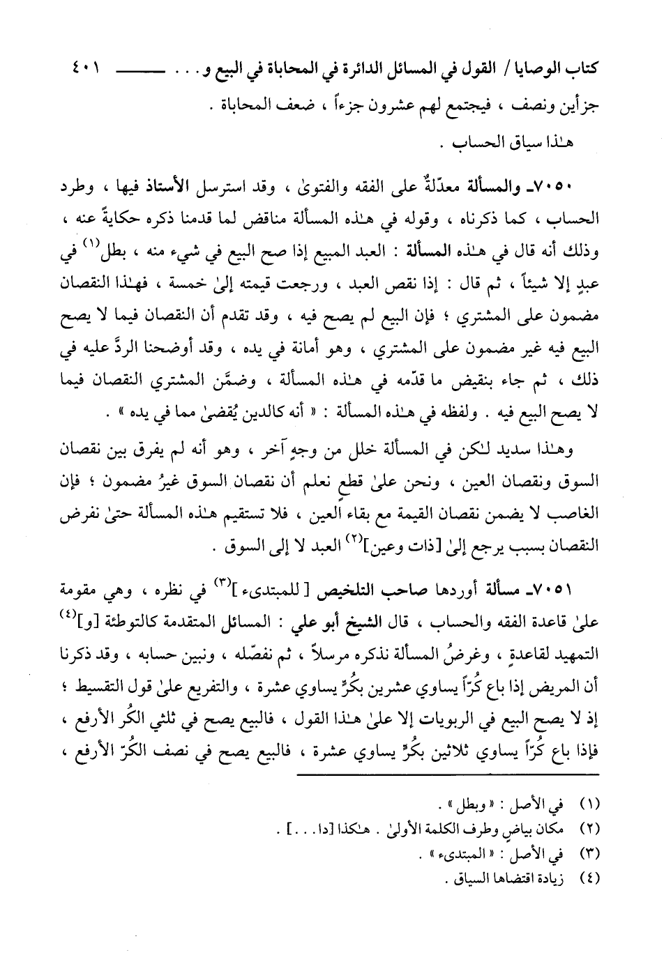 7051 - مسألة أوردها صاحب التلخيص [للمبتدىء] (3) في نظره، وهي مقومة على قاعدة الفقه والحساب، قال الشيخ أبو علي: المسائل المتقدمة كالتوطئة [و] (4) التمهيد لقاعدةٍ، وغرضُ المسألة نذكره مرسلاً، ثم نفصّله، ونبين حسابه، وقد ذكرنا أن المريض إذا باع كُرّاً يساوي عشرين بكُرٍّ يساوي عشرة، والتفريع على قول التقسيط؛ إذ لا يصح البيع في الربويات إلا على هذا القول، فالبيع يصح في ثلثي الكُر الأرفع، فإذا باع كُرّاً يساوي ثلاثين بكُرٍّ يساوي عشرة، فالبيع يصح في نصف الكُرّ الأرفع،