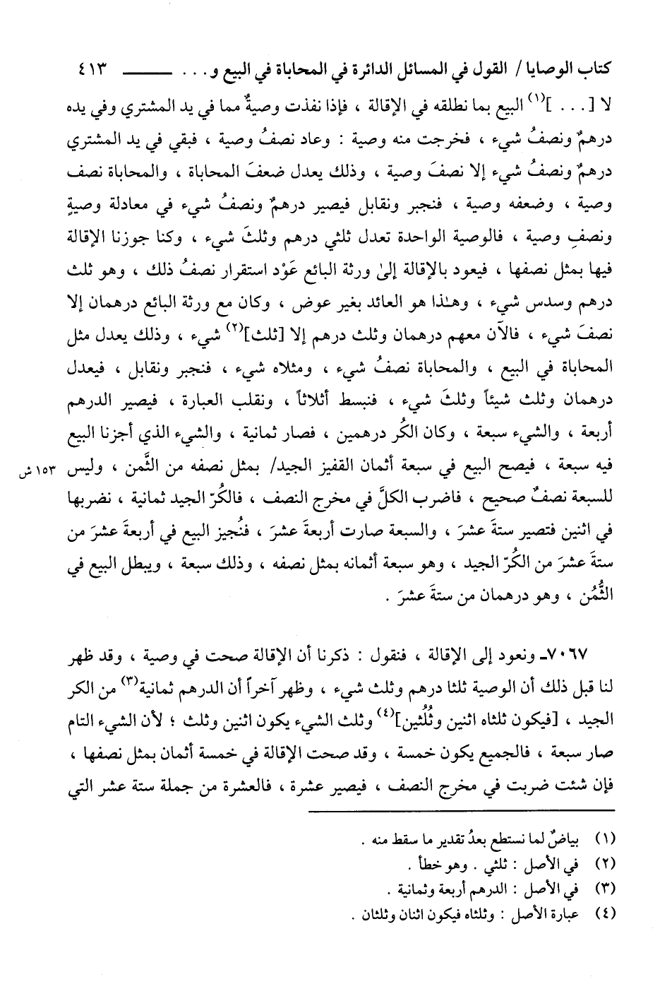 7067 - ونعود إلى الإقالة، فنقول: ذكرنا أن الإقالة صحت في وصية، وقد ظهر لنا قبل ذلك أن الوصية ثلثا درهم وثلث شيء، وظهر آخراً أن الدرهم ثمانية (3) من الكر الجيد، [فيكون ثلثاه اثنين وثُلُثين] (4) وثلث الشيء يكون اثنين وثلث؛ لأن الشيء التام صار سبعة، فالجميع يكون خمسة، وقد صحت الإقالة في خمسة أثمان بمثل نصفها، فإن شئت ضربت في مخرج النصف، فيصير عشرة، فالعشرة من جملة ستة عشر التي