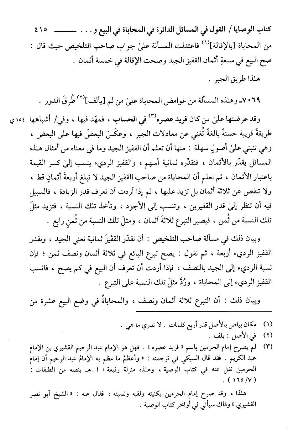 (3) لم يصرح إمام الحرمين باسم "فريد عصره". فهل هو الإمام عبد الرحيم القشيري بن الإمام عبد الكريم. فقد قال السبكي في ترجمته: "وأعظمُ ما عظم به الإمامُ عبد الرحيم أن إمام الحرمين نقل عنه في كتاب الوصية، وهذه منزلة رفيعة" ا. هـ بنصه من الطبقات: (7/ 165).