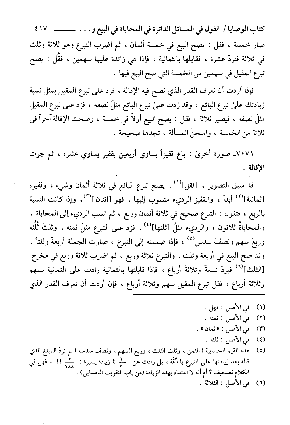 (5) هذه القيم الحسابية (الثمن، وثلث الثلث، وربع السهم، ونصف سدسه) لم تردّ المبلغ الذي قاله بعد زيادتها على التبرع بالدِّقّة، بل زادت عن 1/ 3 4 زيادة يسيرة: 5/ 288!!، فهل في الكلام تصحيف؟ أم أنه لا اعتداد بهذه الزيادة (من باب التقريب الحسابي).