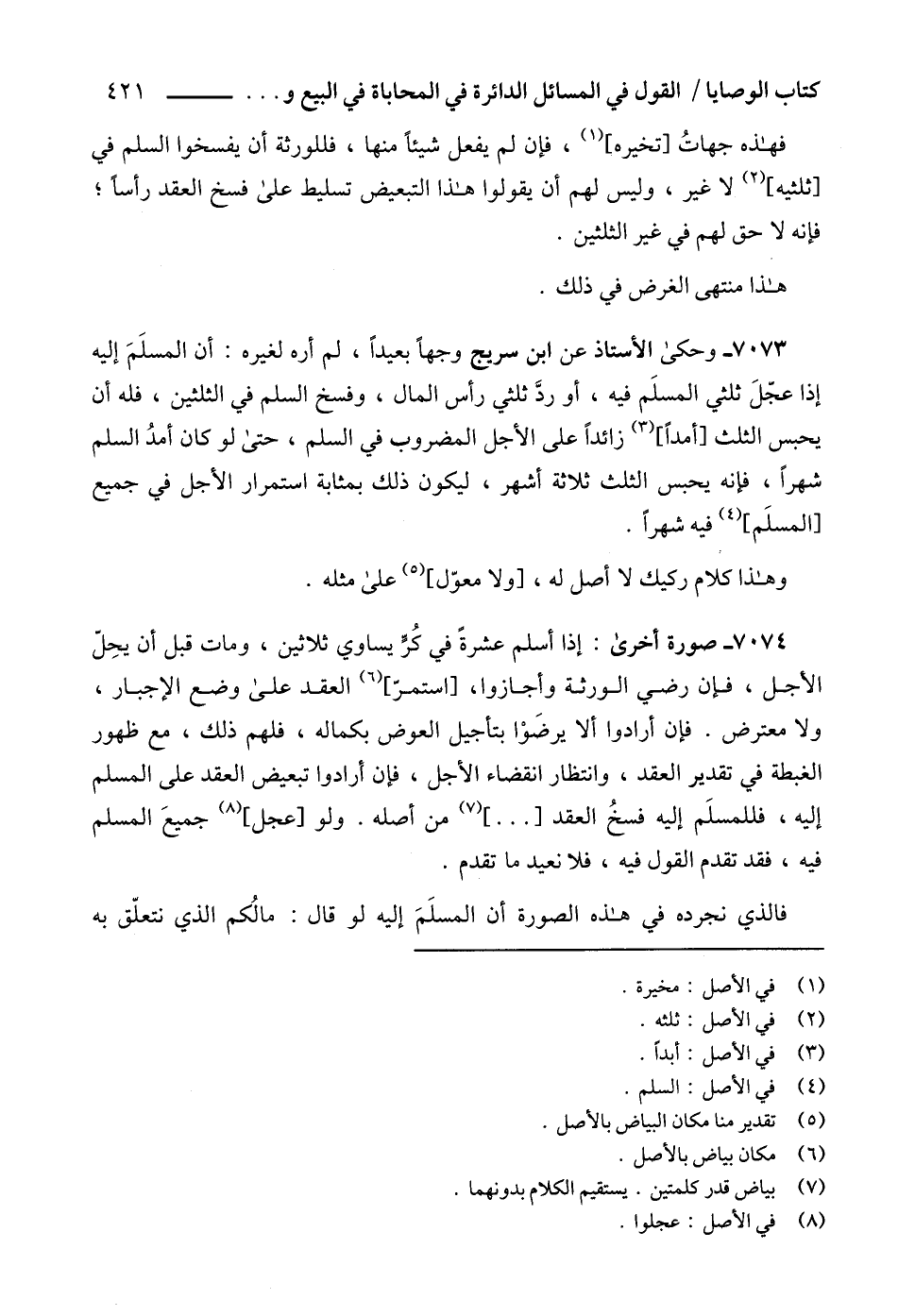 7074 - صورة أخرى: إذا أسلم عشرةً في كُرٍّ يساوي ثلاثين، ومات قبل أن يحِلّ الأجل، فإن رضي الورثة وأجازوا، [استمرّ] (6) العقد على وضع الإجبار، ولا معترض. فإن أرادوا ألا يرضَوْا بتأجيل العوض بكماله، فلهم ذلك، مع ظهور الغبطة في تقدير العقد، وانتظار انقضاء الأجل، فإن أرادوا تبعيض العقد على المسلم إليه، فللمسلَم إليه فسخُ العقد [ ... ] (7) من أصله. ولو [عجل] (8) جميعَ المسلم فيه، فقد تقدم القول فيه، فلا نعيد ما تقدم.