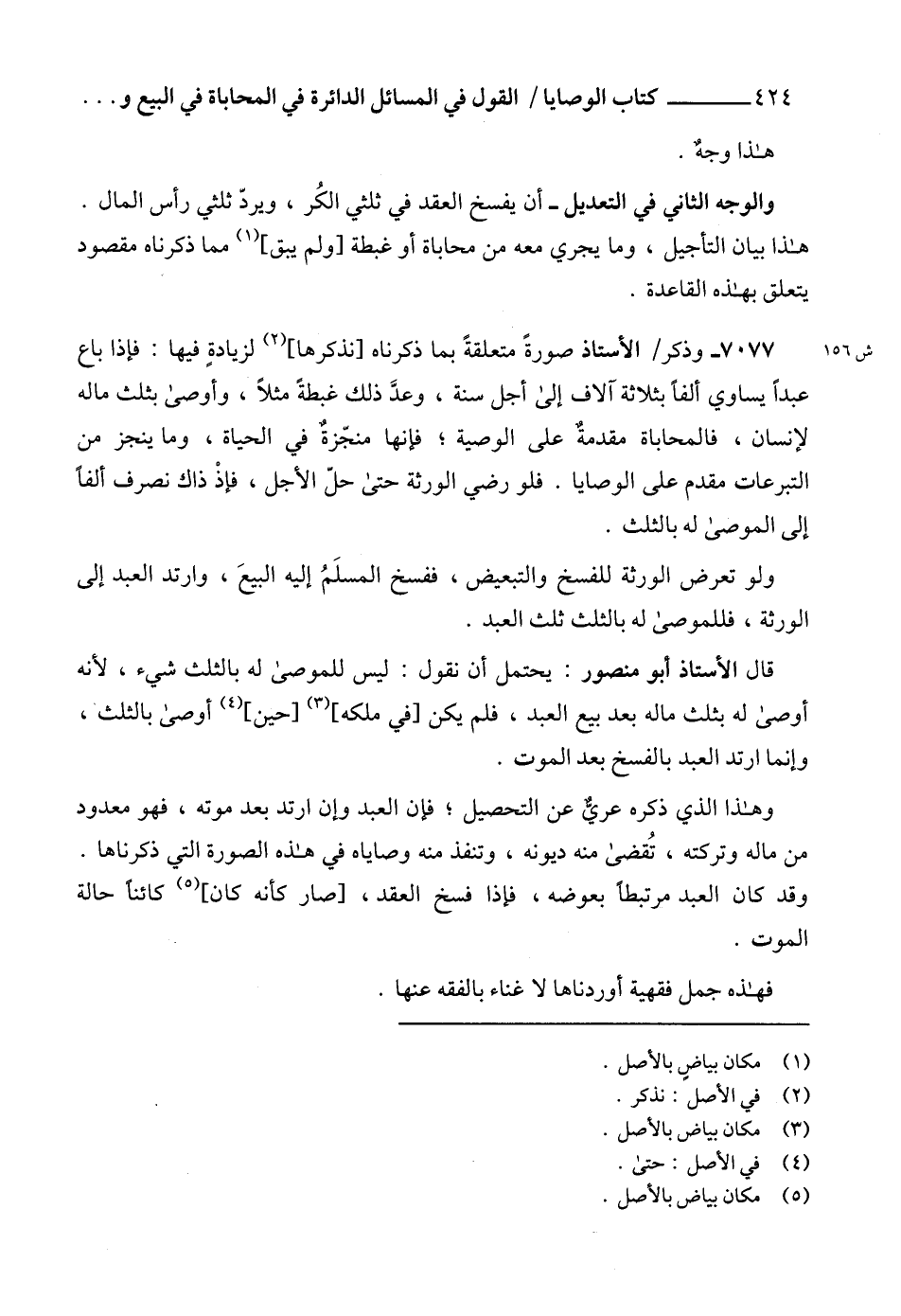 قال الأستاذ أبو منصور: يحتمل أن نقول: ليس للموصى له بالثلث شيء، لأنه أوصى له بثلث ماله بعد بيع العبد، فلم يكن [في ملكه] (3) [حين] (4) أوصى بالثلث، وإنما ارتد العبد بالفسخ بعد الموت.