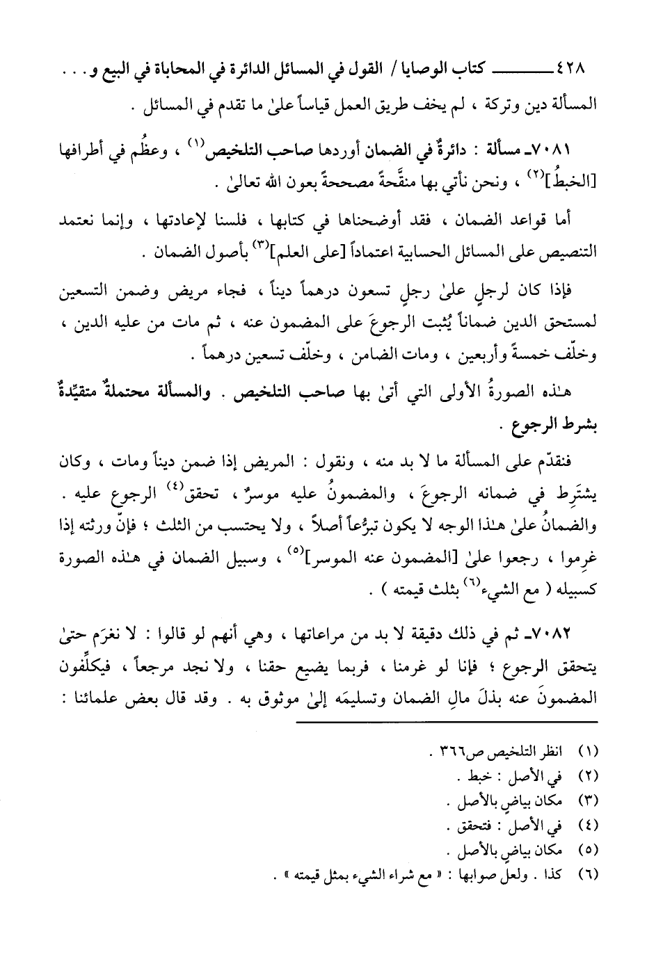 7081 - مسألة: دائرةٌ في الضمان أوردها صاحب التلخيص (1)، وعظُم في أطرافها [الخبطُ] (2)، ونحن نأتي بها منقَّحةً مصححةً بعون الله تعالى.