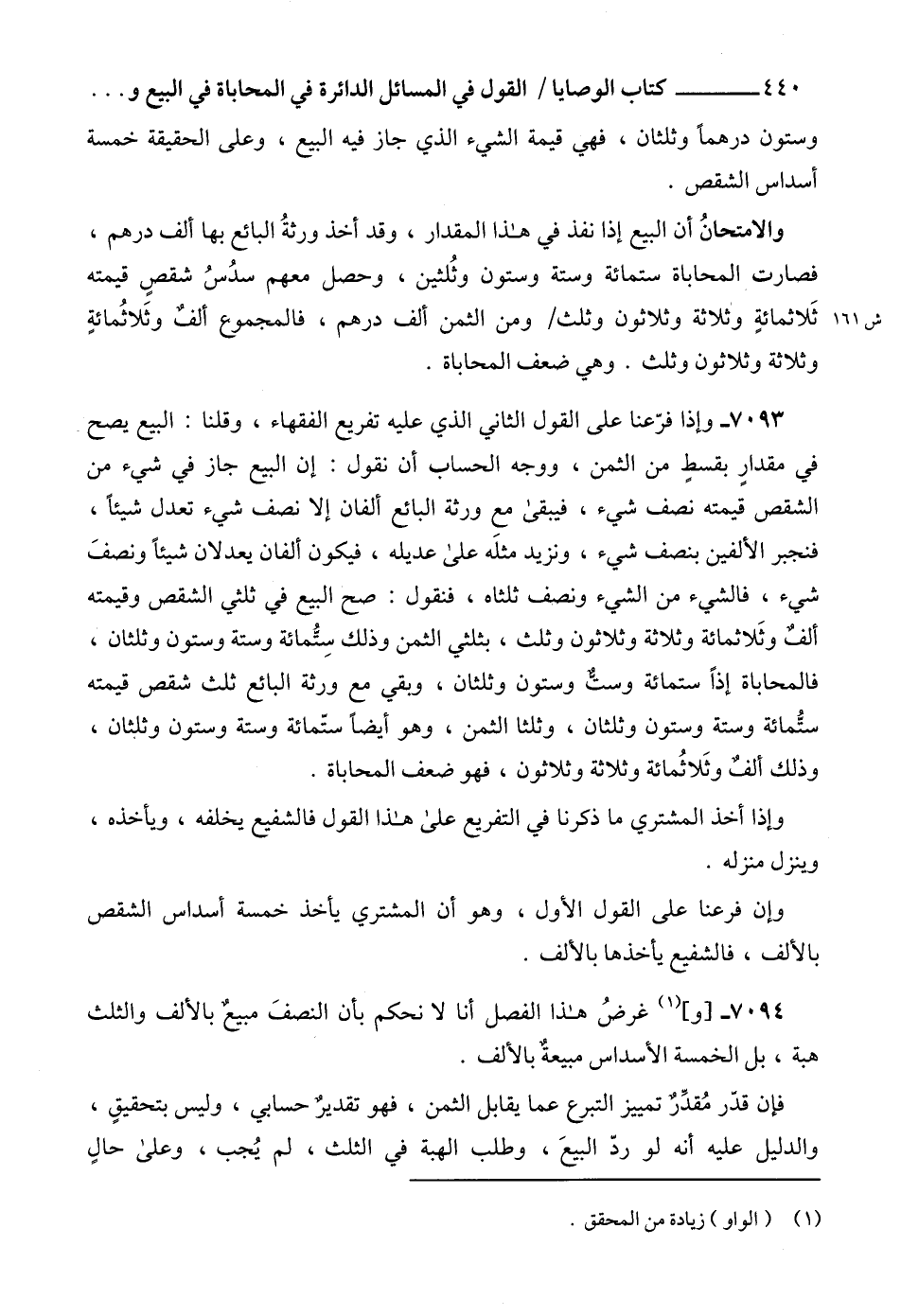 7094 - [و] (1) غرضُ هذا الفصل أنا لا نحكم بأن النصفَ مبيعٌ بالألف والثلث هبة، بل الخمسة الأسداس مبيعةٌ بالألف.