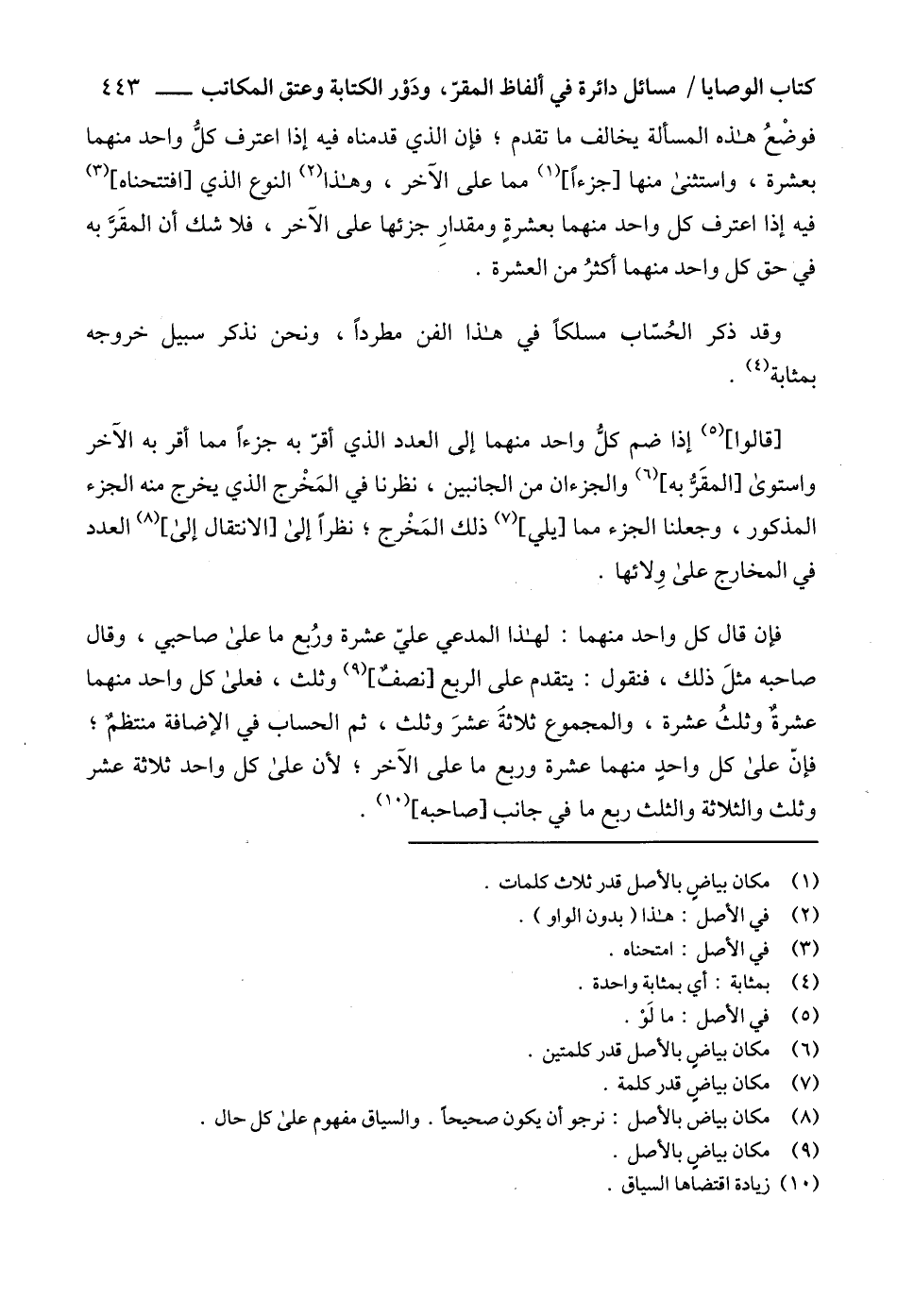 [قالوا] (5) إذا ضم كلُّ واحد منهما إلى العدد الذي أقرّ به جزءاً مما أقر به الآخر واستوى [المقَرُّ به] (6) والجزءان من الجانبين، نظرنا في المَخْرج الذي يخرج منه الجزء المذكور، وجعلنا الجزء مما [يلي] (7) ذلك المَخْرج؛ نظراً إلى [الانتقال إلى] (8) العدد في المخارج على وِلائها.
