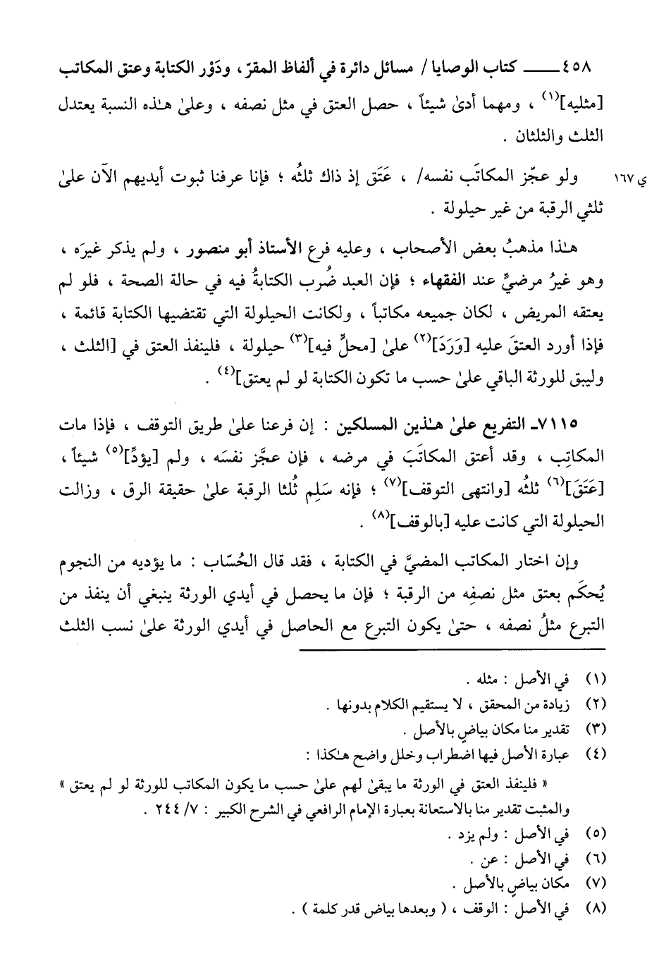 "فلينفذ العتق في الورثة ما يبقى لهم على حسب ما يكون المكاتب للورثة لو لم يعتق" والمثبت تقدير منا بالاستعانة بعبارة الإمام الرافعي في الشرح الكبير: 7/ 244.