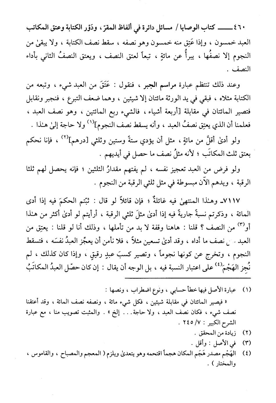 (1) عبارة الأصل فيها خطأ حسابي، ونوع اضطراب، ونصها: "فيصير المائتان في مقابلة شيئين، فكل شيء مائة، ونصفه نصف المائهَ، وقد أعتقنا نصف شيء، فكان نصف العبد، ولا حاجة ... إلخ". والمثبت تصويب منا، مع عبارة الشرح الكبير: 7/ 245.