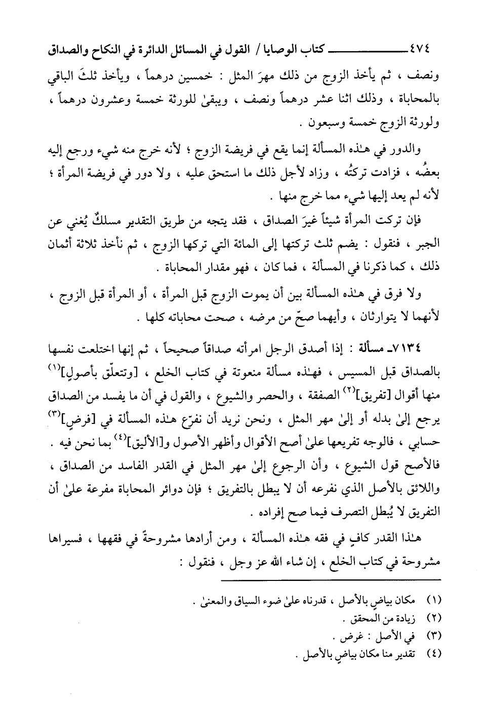 7134 - مسألة: إذا أصدق الرجل امرأته صداقاً صحيحاً، ثم إنها اختلعت نفسها بالصداق قبل المسيس، فهذه مسألة منعوتة في كتاب الخلع، [وتتعلّق بأصولٍ] (1) منها أقوال [تفريق] (2) الصفقة، والحصر والشيوع، والقول في أن ما يفسد من الصداق يرجع إلى بدله أو إلى مهر المثل، ونحن نريد أن نفرّع هذه المسألة في [فرضٍ] (3) حسابي، فالوجه تفريعها على أصح الأقوال وأظهر الأصول و [الأليق] (4) بما نحن فيه.