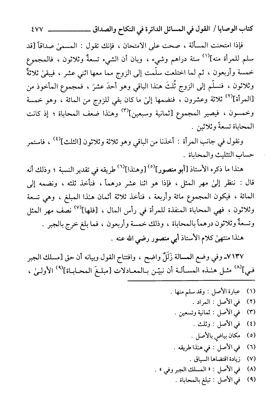 7137 - وفي وضع المسألة زَلَلٌ واضح، وافتتاح القول وبيانه أن حق [مسلك الجبر في] (8) مثل هذه المسألة أن نبيّن بالمعادلات [مبلغَ المحاباة] (9) الأولى،