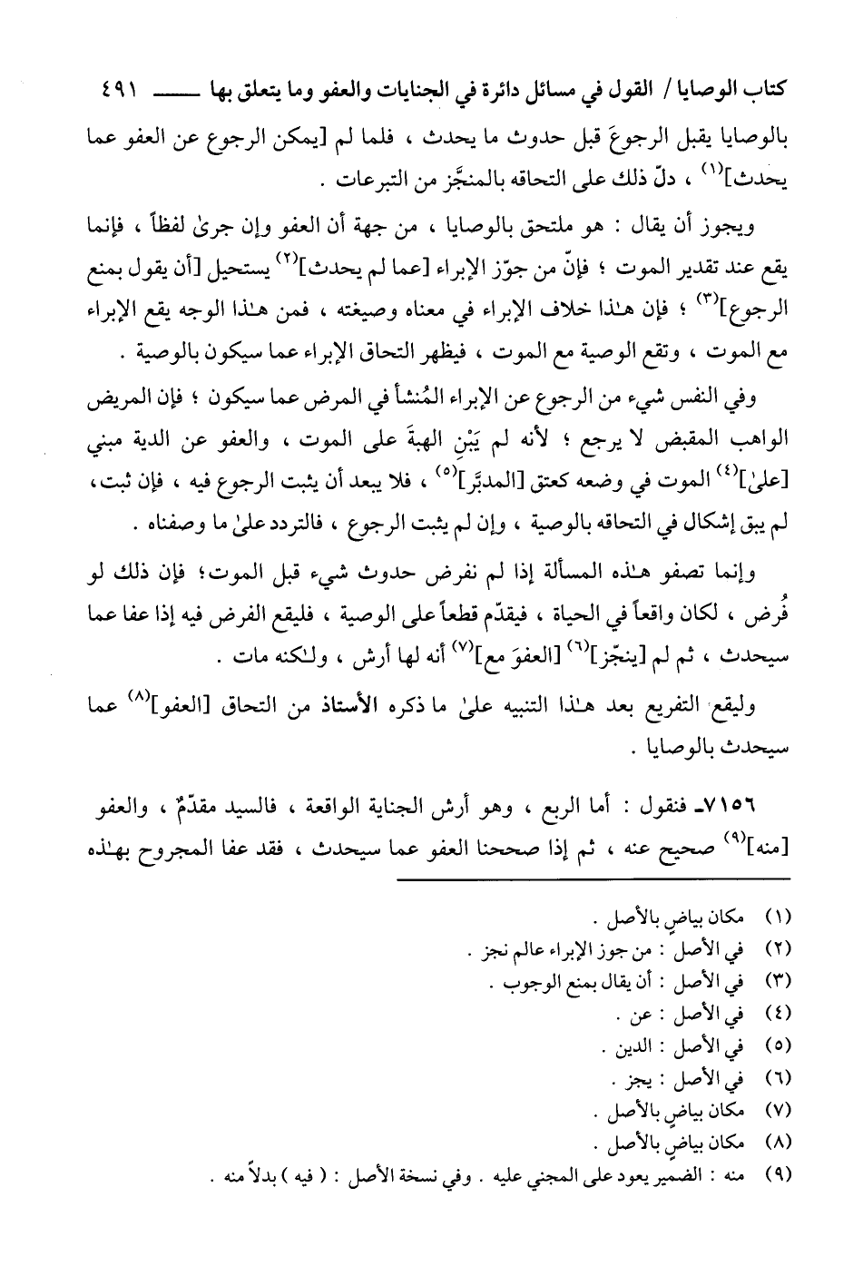 ويجوز أن يقال: هو ملتحق بالوصايا، من جهة أن العفو وإن جرى لفظاً، فإنما يقع عند تقدير الموت؛ فإنّ من جوّز الإبراء [عما لم يحدث] (2) يستحيل [أن يقول بمنع الرجوع] (3)؛ فإن هذا خلاف الإبراء في معناه وصيغته، فمن هذا الوجه يقع الإبراء مع الموت، وتقع الوصية مع الموت، فيظهر التحاق الإبراء عما سيكون بالوصية.