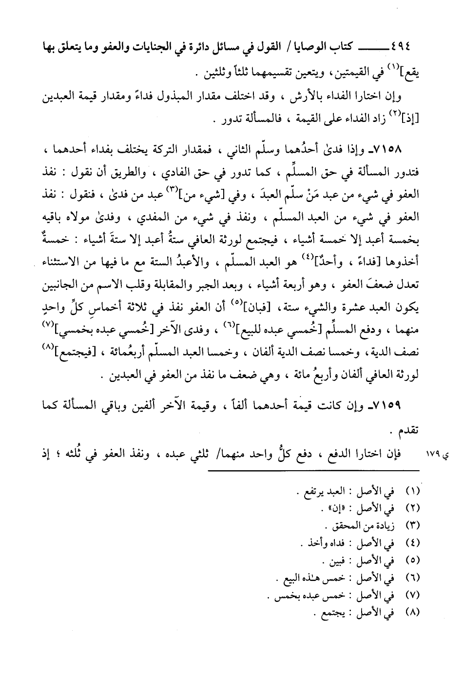 7158 - وإذا فدى أحدُهما وسلّم الثاني، فمقدار التركة يختلف بفداء أحدهما، فتدور المسألة في حق المسلِّم، كما تدور في حق الفادي، والطريق أن نقول: نفذ العفو في شيء من عبد مَنْ سلّم العبدَ، وفي [شيء من] (3) عبد من فدى، فنقول: نفذ العفو في شيء من العبد المسلّم، ونفذ في شيء من المفدي، وفدى مولاه باقيه بخمسة أعبد إلا خمسة أشياء، فيجتمع لورثة العافي ستةُ أعبد إلا ستةَ أشياء: خمسةٌ أخذوها [فداءً، وأحدٌ] (4) هو العبد المسلّم، والأعبدُ الستة مع ما فيها من الاستثناء تعدل ضعفَ العفو، وهو أربعة أشياء، وبعد الجبر والمقابلة وقلب الاسم من الجانبين يكون العبد عشرة والشيء ستة، [فبان] (5) أن العفو نفذ في ثلاثة أخماسِ كلِّ واحدٍ منهما، ودفع المسلِّم [خُمسي عبده للبيع] (6)، وفدى الآخر [خُمسي عبده بخمسي] (7) نصف الدية، وخمسا نصف الدية ألفان، وخمسا العبد المسلّم أربعُمائة، [فيجتمع] (8) لورثة العافي ألفان وأربعُ مائة، وهي ضعف ما نفذ من العفو في العبدين.