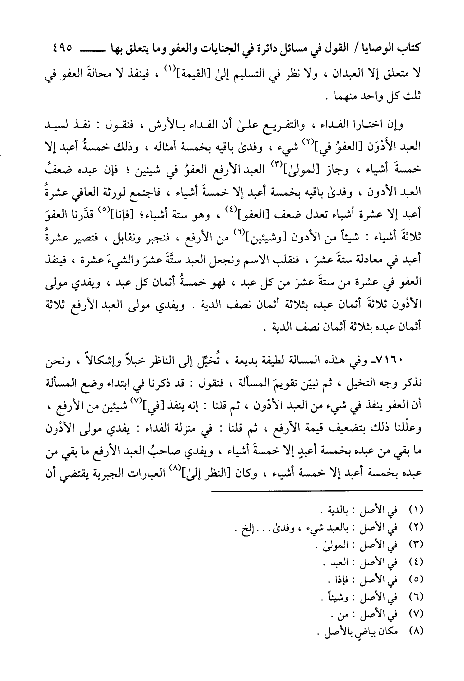 7160 - وفي هذه المسألة لطيفة بديعة، تُخيِّل إلى الناظر خبلاً وإشكالاً، ونحن نذكر وجه التخيل، ثم نبيّن تقويمَ المسألة، فنقول: قد ذكرنا في ابتداء وضع المسألة أن العفو ينفذ في شيء من العبد الأدْون، ثم قلنا: إنه ينفذ [في] (7) شيئين من الأرفع، وعلّلنا ذلك بتضعيف قيمة الأرفع، ثم قلنا: في منزلة الفداء: يفدي مولى الأدْون ما بقي من عبده بخمسة أعبدٍ إلا خمسةَ أشياء، ويفدي صاحبُ العبد الأرفع ما بقي من عبده بخمسة أعبد إلا خمسة أشياء، وكان [النظر إلى] (8) العبارات الجبرية يقتضي أن
