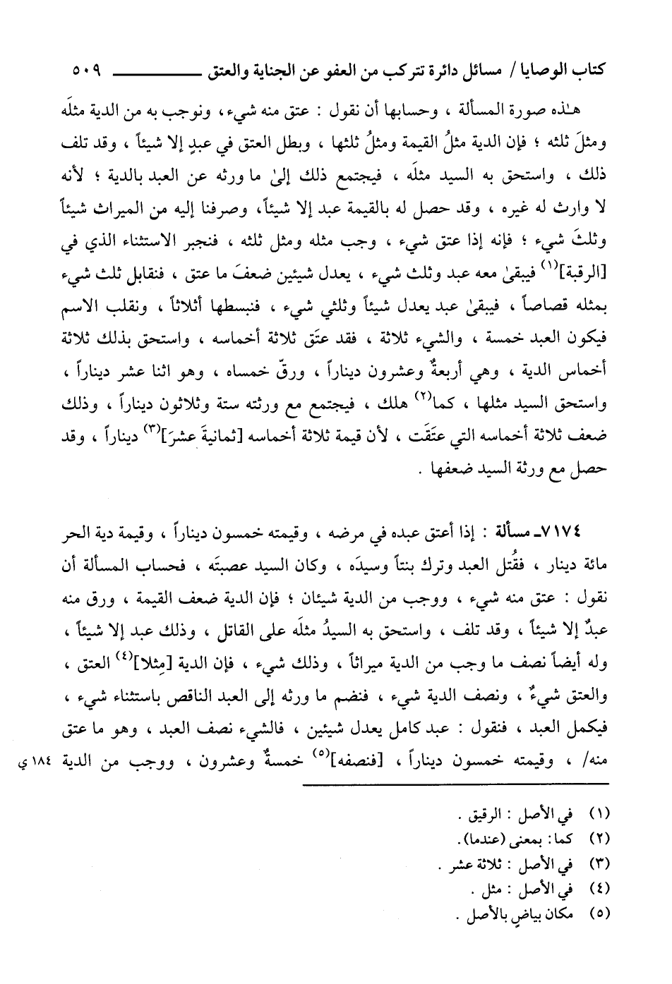 7174 - مسألة: إذا أعتق عبده في مرضه، وقيمته خمسون ديناراً، وقيمة دية الحر مائة دينار، فقُتل العبد وترك بنتاً وسيدَه، وكان السيد عصبتَه، فحساب المسألة أن نقول: عتق منه شيء، ووجب من الدية شيئان؛ فإن الدية ضعف القيمة، ورق منه عبدٌ إلا شيئاً، وقد تلف، واستحق به السيدُ مثلَه على القاتل، وذلك عبد إلا شيئاً، وله أيضاً نصف ما وجب من الدية ميراثاً، وذلك شيء، فإن الدية [مِثلا] (4) العتق، والعتق شيءٌ، ونصف الدية شيء، فنضم ما ورثه إلى العبد الناقص باستثناء شيء، فيكمل العبد، فنقول: عبد كامل يعدل شيئين، فالشيء نصف العبد، وهو ما عتق منه، وقيمته خمسون ديناراً، [فنصفه] (5) خمسةٌ وعشرون، ووجب من الدية