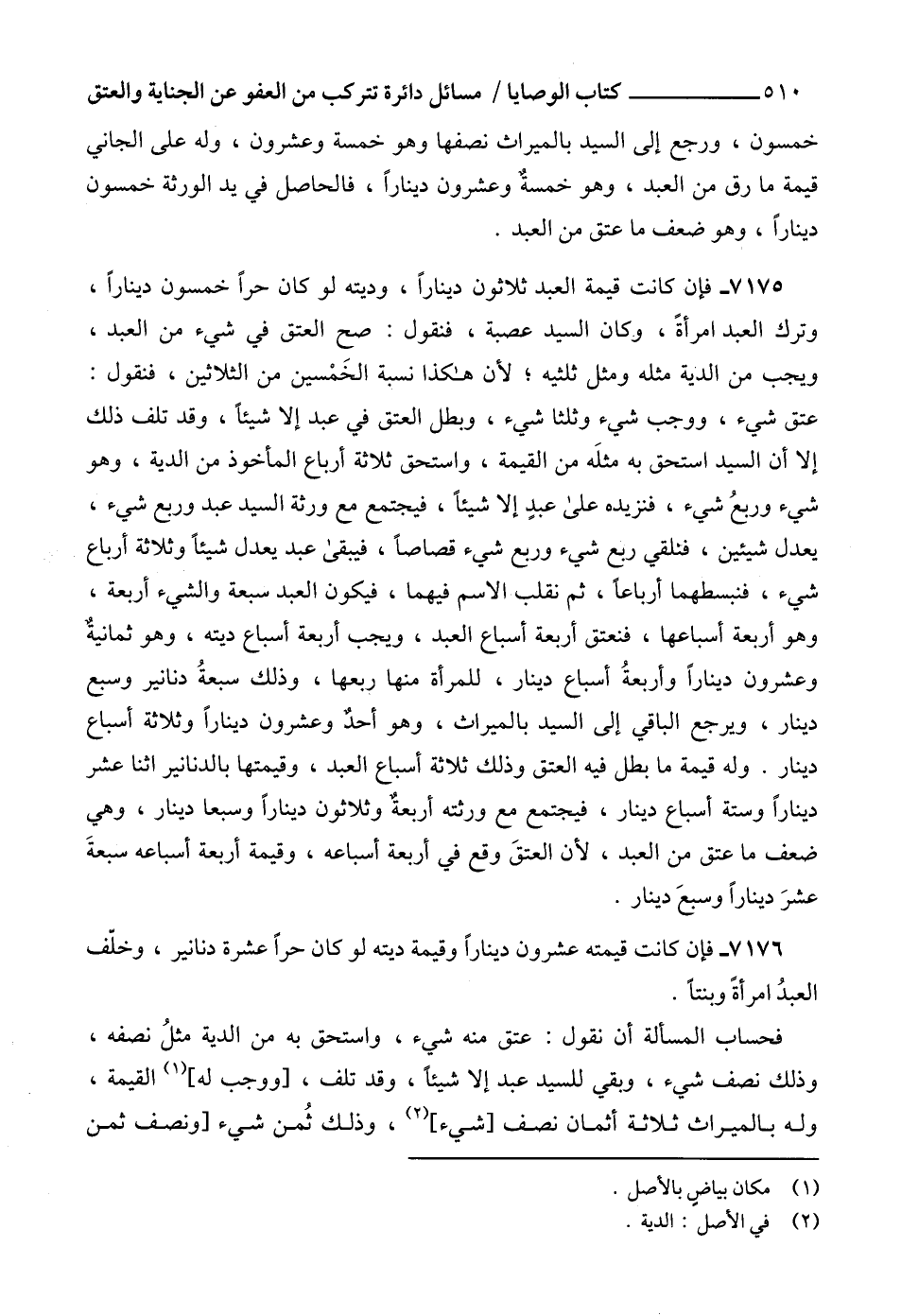 7176 - فإن كانت قيمته عشرون ديناراً وقيمة ديته لو كان حراً عشرة دنانير، وخلّف العبدُ امرأةً وبنتاً.