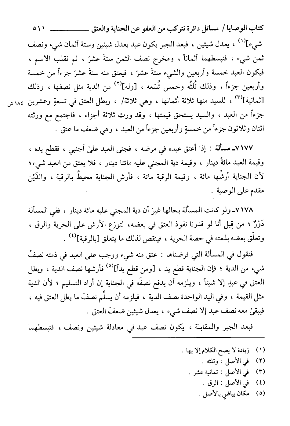 شيء] (1)، يعدل شيئين، فبعد الجبر يكون عبد يعدل شيئين وستة أثمان شيء ونصف ثمن شيء، فنبسطهما أثماناً، ومخرج نصف الثمن ستةَ عشرَ، ثم نقلب الاسم، فيكون العبد خمسة وأربعين والشيء ستةَ عشرَ، فيعتق منه ستةَ عشرَ جزءاً من خمسة وأربعين جزءاً، وذلك ثُلثُه وخمس تُسْعه، [وله] (2) من الدية مثل نصفها، وذلك [ثمانية] (3)، للسيد منها ثلاثة أثمانها، وهي ثلاثة، وبطل العتق في تسعةٍ وعشرين جزءاً من العبد، والسيد يستحق قيمتها، وقد ورث ثلاثة أجزاء، فاجتمع مع ورثته اثنان وثلاثون جزءاً من خمسةٍ وأربعين جزءاً من العبد، وهي ضعف ما عتق.