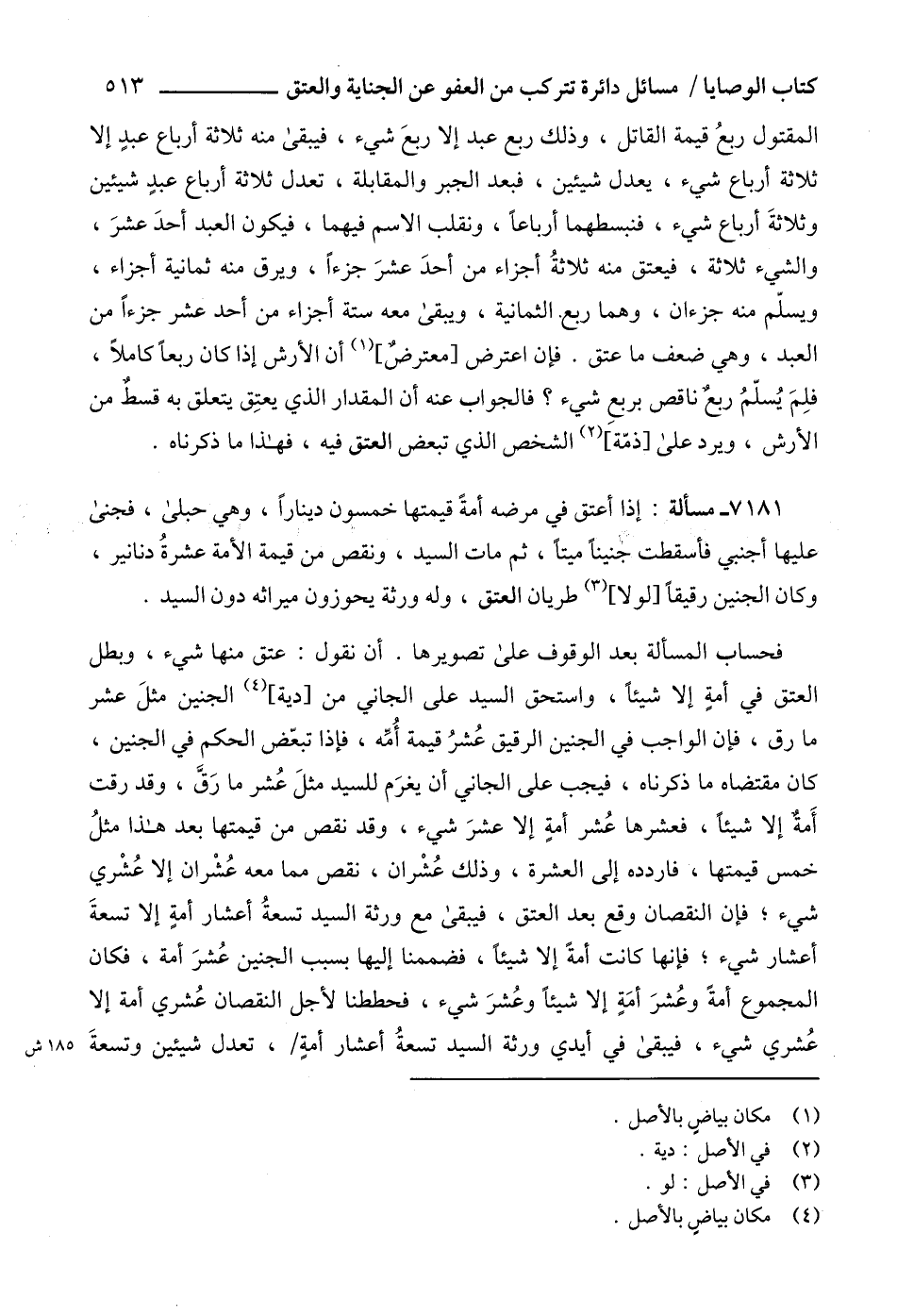 فحساب المسألة بعد الوقوف على تصويرها. أن نقول: عتق منها شيء، وبطل العتق في أمةٍ إلا شيئاً، واستحق السيد على الجاني من [دية] (4) الجنين مثلَ عشر ما رق، فإن الواجب في الجنين الرقيق عُشرُ قيمة أُمِّه، فإذا تبعّض الحكم في الجنين، كان مقتضاه ما ذكرناه، فيجب على الجاني أن يغرَم للسيد مثلَ عُشر ما رَقَّ، وقد رقت أَمةٌ إلا شيئاً، فعشرها عُشر أمةٍ إلا عشرَ شيء، وقد نقص من قيمتها بعد هذا مثلُ خمس قيمتها، فاردده إلى العشرة، وذلك عُشْران، نقص مما معه عُشْران إلا عُشْري شيء؛ فإن النقصان وقع بعد العتق، فيبقى مع ورثة السيد تسعةُ أعشار أمةٍ إلا تسعةَ أعشار شيء؛ فإنها كانت أمةً إلا شيئاً، فضممنا إليها بسبب الجنين عُشرَ أمة، فكان المجموع أمةً وعُشرَ أمَةٍ إلا شيئاً وعُشرَ شيء، فحططنا لأجل النقصان عُشري أمة إلا عُشري شيء، فيبقى في أيدي ورثة السيد تسعةُ أعشار أمةٍ، تعدل شيئين وتسعة