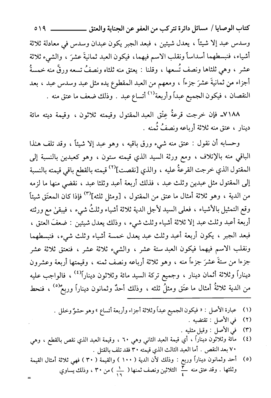 (1) عبارة الأصل: "فيكون الجميع عبداً وثلاثة أجزاء وأربعة أتساع" وهو حشوٌ وخلل.