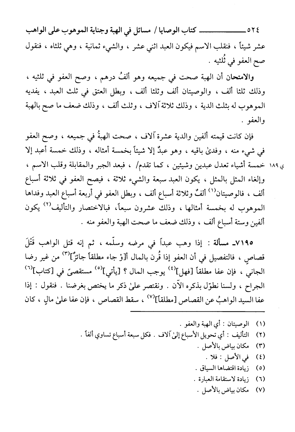 7195 - مسألة: إذا وهب عبداً في مرضه وسلّمه، ثم إنه قتل الواهب قَتْلَ قصاصٍ، فالتفصيل في أن العفو إذا قُرن بالمال [أوْ جاء مطلقاً جائزٌ] (3) من غير رضا الجاني، فإن عفا مطلقاً [فهل] (4) يوجب المال؟ [يأتي] (5) مستقصىً في [كتاب] (6) الجراح، ولسنا نطوّل بذكره الآن. ونقتصر على ذكر ما يختص بغرضنا. فنقول: إذا عفا السيد الواهبُ عن القصاص [مطلقاً] (7)، سقط القصاص، فإن عفا على مالٍ، كان