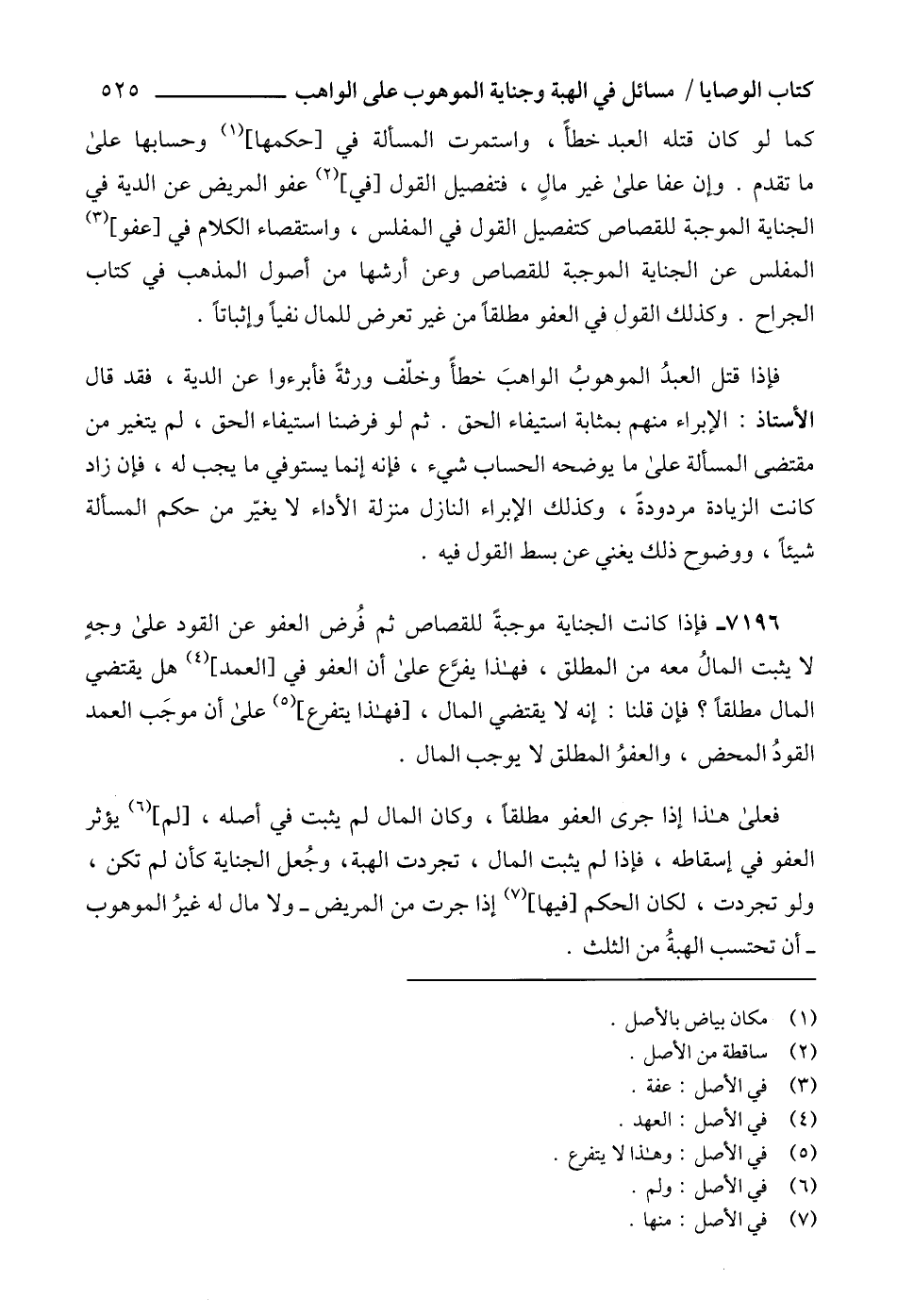 فإذا قتل العبدُ الموهوبُ الواهبَ خطأً وخلّف ورثةً فأبرءوا عن الدية، فقد قال الأستاذ: الإبراء منهم بمثابة استيفاء الحق. ثم لو فرضنا استيفاء الحق، لم يتغير من مقتضى المسألة على ما يوضحه الحساب شيء، فإنه إنما يستوفي ما يجب له، فإن زاد كانت الزيادة مردودةً، وكذلك الإبراء النازل منزلة الأداء لا يغيّر من حكم المسألة شيئاً، ووضوح ذلك يغني عن بسط القول فيه.