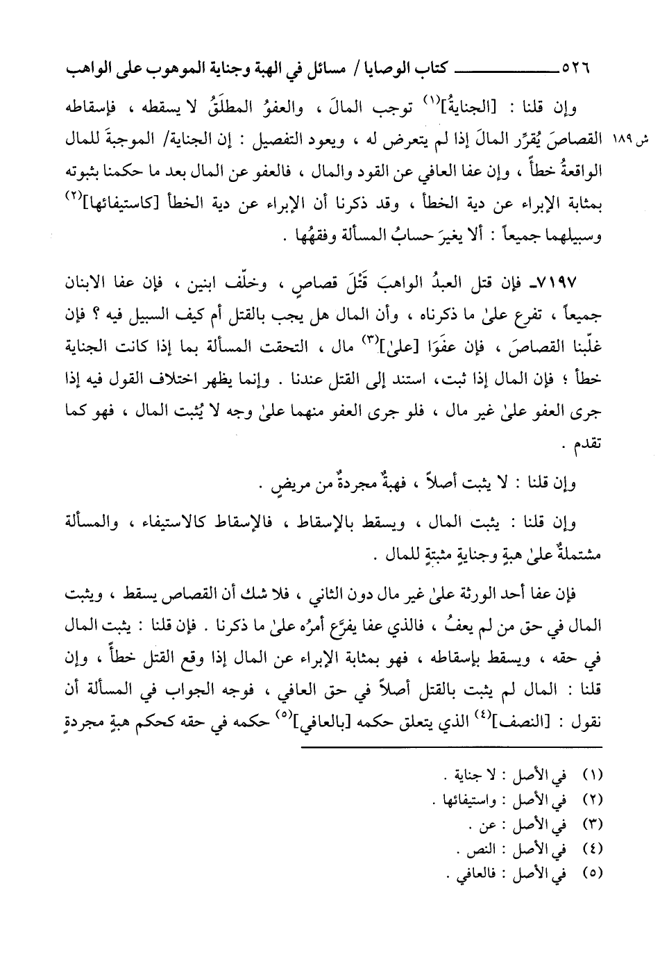 7197 - فإن قتل العبدُ الواهبَ قَتْلَ قصاصٍ، وخلّف ابنين، فإن عفا الابنان جميعاً، تفرع على ما ذكرناه، وأن المال هل يجب بالقتل أم كيف السبيل فيه؟ فإن غلّبنا القصاصَ، فإن عفَوَا [على] (3) مال، التحقت المسألة بما إذا كانت الجناية خطأ؛ فإن المال إذا ثبت، استند إلى القتل عندنا. وإنما يظهر اختلاف القول فيه إذا جرى العفو على غير مال، فلو جرى العفو منهما على وجه لا يُثبت المال، فهو كما تقدم.