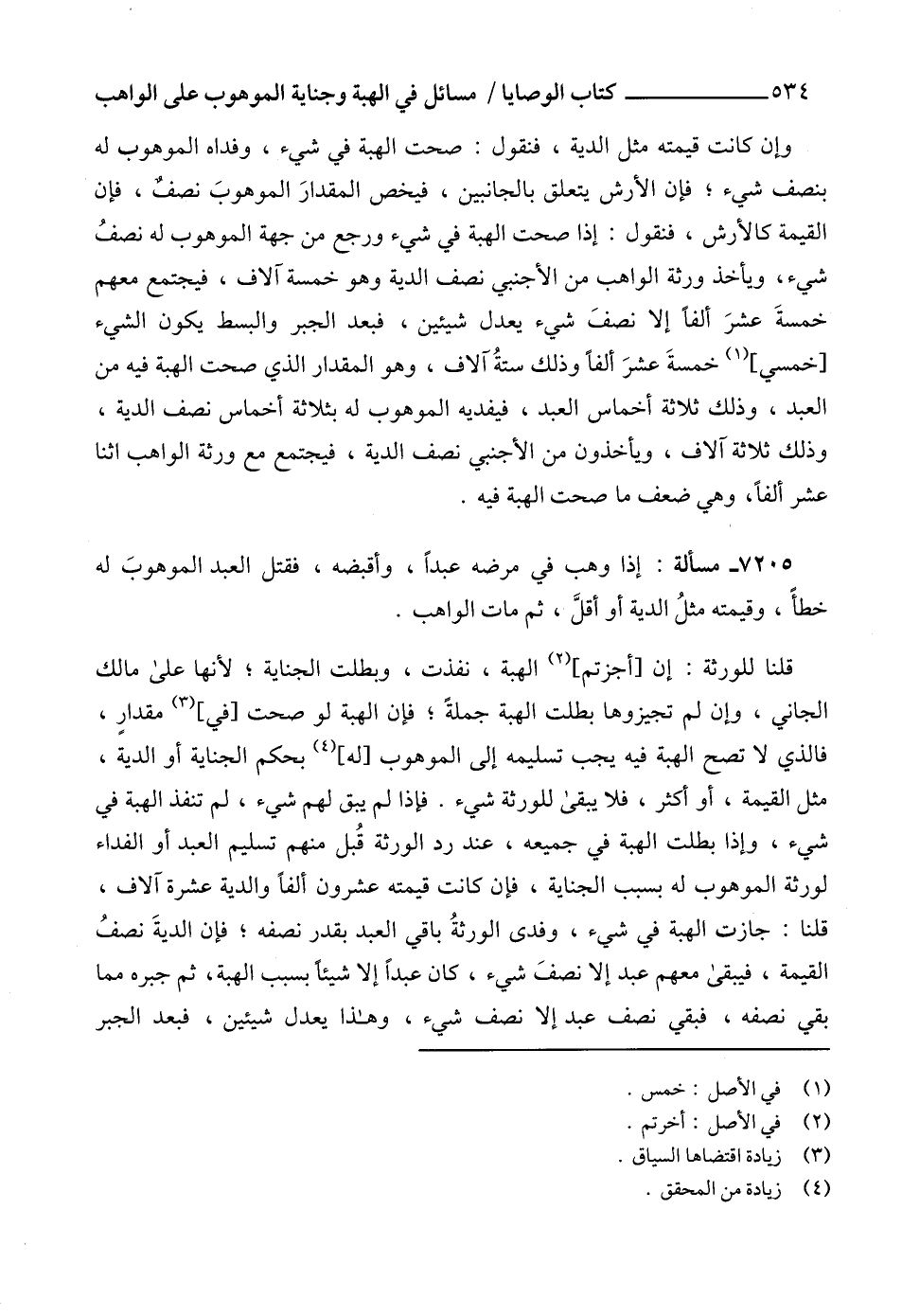 وإن كانت قيمته مثل الدية، فنقول: صحت الهبة في شيء، وفداه الموهوب له بنصف شيء؛ فإن الأرش يتعلق بالجانبين، فيخص المقدارَ الموهوبَ نصفٌ، فإن القيمة كالأرش، فنقول: إذا صحت الهبة في شيء ورجع من جهة الموهوب له نصفُ شيء، ويأخذ ورثة الواهب من الأجنبي نصف الدية وهو خمسة آلاف، فيجتمع معهم خمسةَ عشرَ ألفاً إلا نصفَ شيء يعدل شيئين، فبعد الجبر والبسط يكون الشيء [خمسي] (1) خمسة عشرَ ألفاً وذلك ستةُ الاف، وهو المقدار الذي صحت الهبة فيه من العبد، وذلك ثلاثة أخماس العبد، فيفديه الموهوب له بثلاثة أخماس نصف الدية، وذلك ثلاثة آلاف، ويأخذون من الأجنبي نصف الدية، فيجتمع مع ورثة الواهب اثنا عشر ألفاً، وهي ضعف ما صحت الهبة فيه.