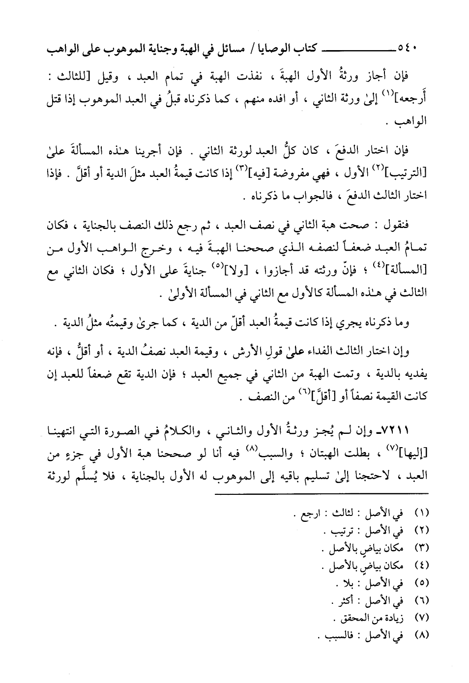 فنقول: صحت هبة الثاني في نصف العبد، ثم رجع ذلك النصف بالجناية، فكان تمامُ العبد ضعفاً لنصفه الذي صححنا الهبةَ فيه، وخرج الواهب الأول من [المسألة] (4)؛ فإنّ ورثته قد أجازوا، [ولا] (5) جنايةَ على الأول؛ فكان الثاني مع الثالث في هذه المسألة كالأول مع الثاني في المسألة الأولى.