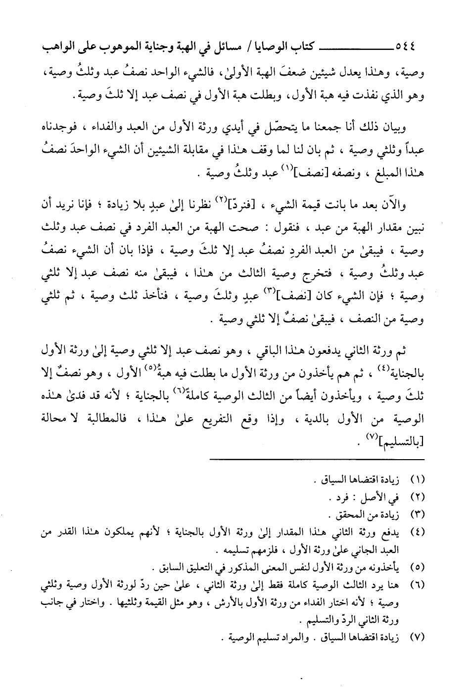 (6) هنا يرد الثالث الوصية كاملة فقط إلى ورثة الثاني، على حين ردّ لورثة الأول وصية وثلثي وصية؛ لأنه اختار الفداء من ورثة الأول بالأرش، وهو مثل القيمة وثلثيها. واختار في جانب ورثة الثاني الردّ والتسليم.