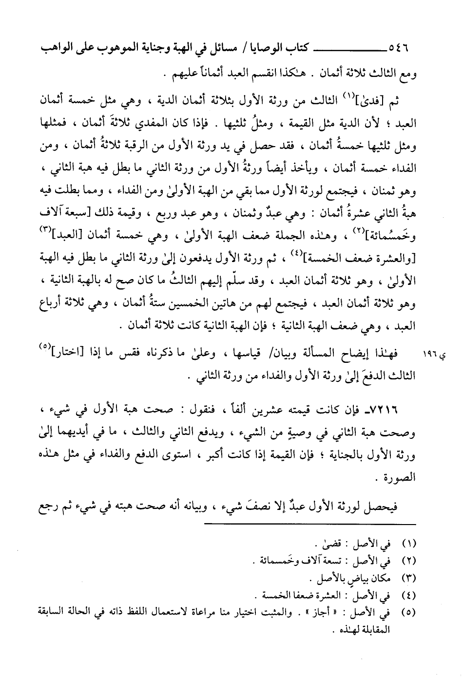 ثم [فدى] (1) الثالث من ورثة الأول بثلاثة أثمان الدية، وهي مثل خمسة أثمان العبد؛ لأن الدية مثل القيمة، ومثلُ ثلثيها. فإذا كان المفدي ثلاثةَ أثمان، فمثلها ومثل ثلثيها خمسةُ أثمان، فقد حصل في يد ورثة الأول من الرقبة ثلاثةُ أثمان، ومن الفداء خمسة أثمان، ويأخذ أيضاً ورثةُ الأول من ورثة الثاني ما بطل فيه هبة الثاني، وهو ثمنان، فيجتمع لورثة الأول مما بقي من الهبة الأولى ومن الفداء، ومما بطلت فيه هبةُ الثاني عشرةُ أثمان: وهي عبدٌ وثمنان، وهو عبد وربع، وقيمة ذلك [سبعة آلاف وخَمسُمائة] (2)، وهذه الجملة ضعف الهبة الأولى، وهي خمسة أثمان [العبد] (3)