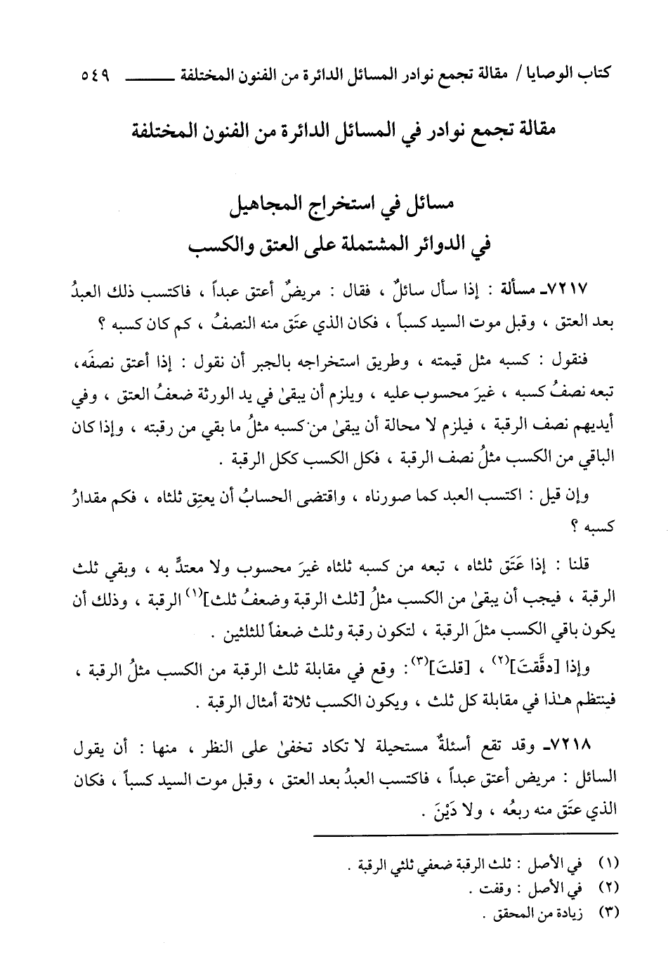 7218 - وقد تقع أسئلةٌ مستحيلة لا تكاد تخفى على النظر، منها: أن يقول السائل: مريض أعتق عبداً، فاكتسب العبدُ بعد العتق، وقبل موت السيد كسباً، فكان الذي عتَق منه ربعُه، ولا دَيْنَ.