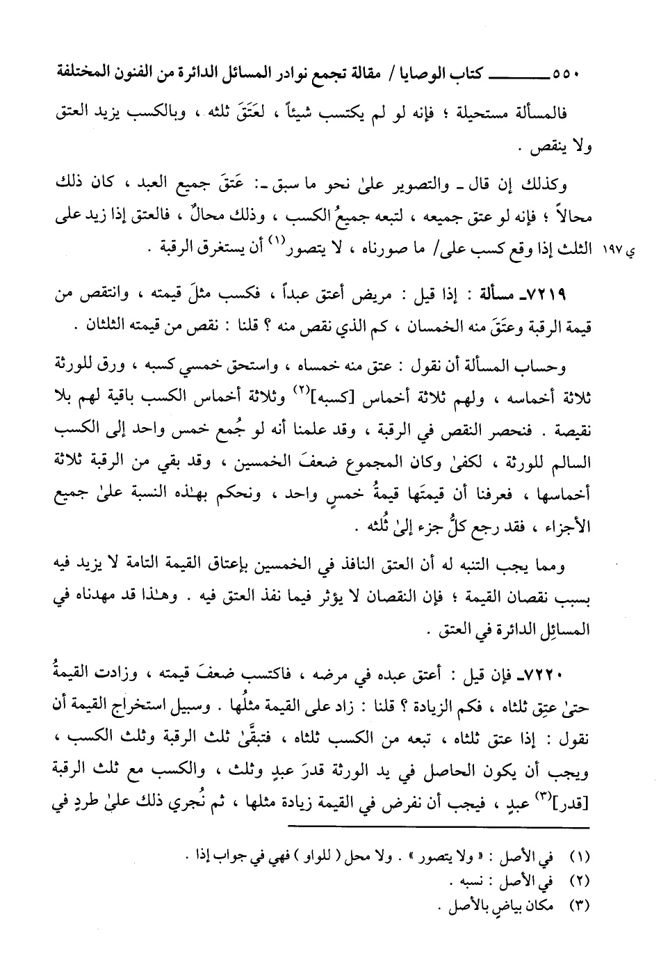 7220 - فإن قيل: أعتق عبده في مرضه، فاكتسب ضعفَ قيمته، وزادت القيمةُ حتى عتِق ثلثاه، فكم الزيادة؟ قلنا: زاد على القيمة مثلُها. وسبيل استخراج القيمة أن نقول: إذا عتق ثلثاه، تبعه من الكسب ثلثاه، فتبقَّى ثلث الرقبة وثلث الكسب، ويجب أن يكون الحاصل في يد الورثة قدرَ عبدٍ وثلث، والكسب مع ثلث الرقبة [قدر] (3) عبدٍ، فيجب أن نفرض في القيمة زيادة مثلها، ثم نُجري ذلك على طردٍ في
