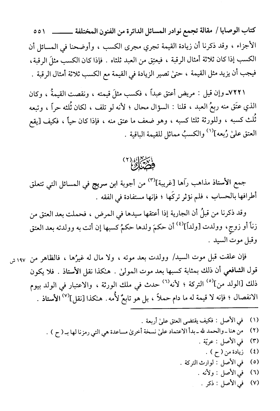 جمع الأستاذ مذاهب رآها [غريبة] (3) من أجوبة ابن سريج في المسائل التي تتعلق أطرافها بالحساب، فلم نؤثر تركَها؛ فإنها مستفادة في الفقه.