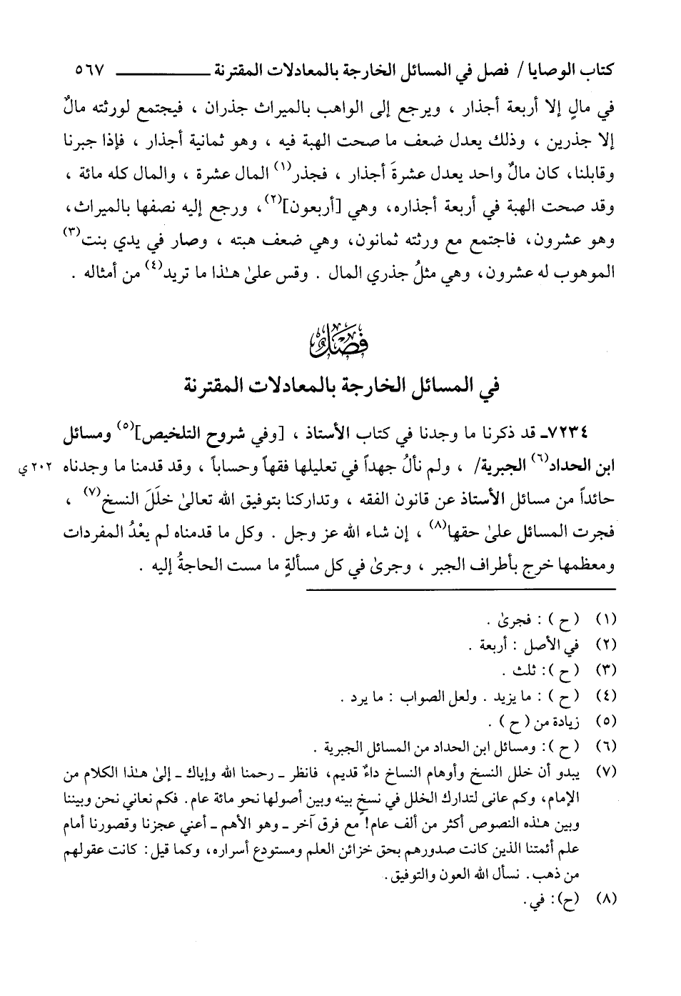 7234 - قد ذكرنا ما وجدنا في كتاب الأستاذ، [وفي شروح التلخيص] (5) ومسائل ابن الحداد (6) الجبرية، ولم نألُ جهداً في تعليلها فقهاً وحساباً، وقد قدمنا ما وجدناه حائداً من مسائل الأستاذ عن قانون الفقه، وتداركنا بتوفيق الله تعالى خلَلَ النسخ (7)، فجرت المسائل على حقها (8)، إن شاء الله عز وجل. وكل ما قدمناه لم يعْدُ المفردات ومعظمها خرج بأطراف الجبر، وجرى في كل مسألةٍ ما مست الحاجةُ إليه.