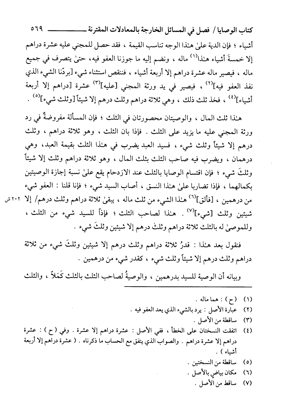 (4) اتفقت النسختان على الخطأ، ففي الأصل: عشرة دراهم إلا عشرة. وفي (ح): عشرة دراهم إلا عشرة دراهم. والصواب الذي يتفق مع الحساب ما ذكرناه. (عشرة دراهم إلا أربعة أشياء).