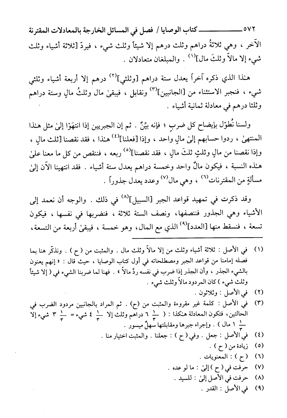 (1) في الأصل: ثلاثة أشياء وثلث من إلا مالاً وثلث مال. والمثبت من (ح). ونذكّر هنا بما فصله إمامنا من قواعد الجبر ومصطلحاته في أول كتاب الوصايا، حيث قال: "إنهم يعنون بالشيء الجذر، وأن الجذر إذا ضرب في نفسه ردَّ مالاً". فهنا لما ضربنا الشيء في (إلا شيئاً وثلث شيء) كان المردود مالاً وثلث شيء.