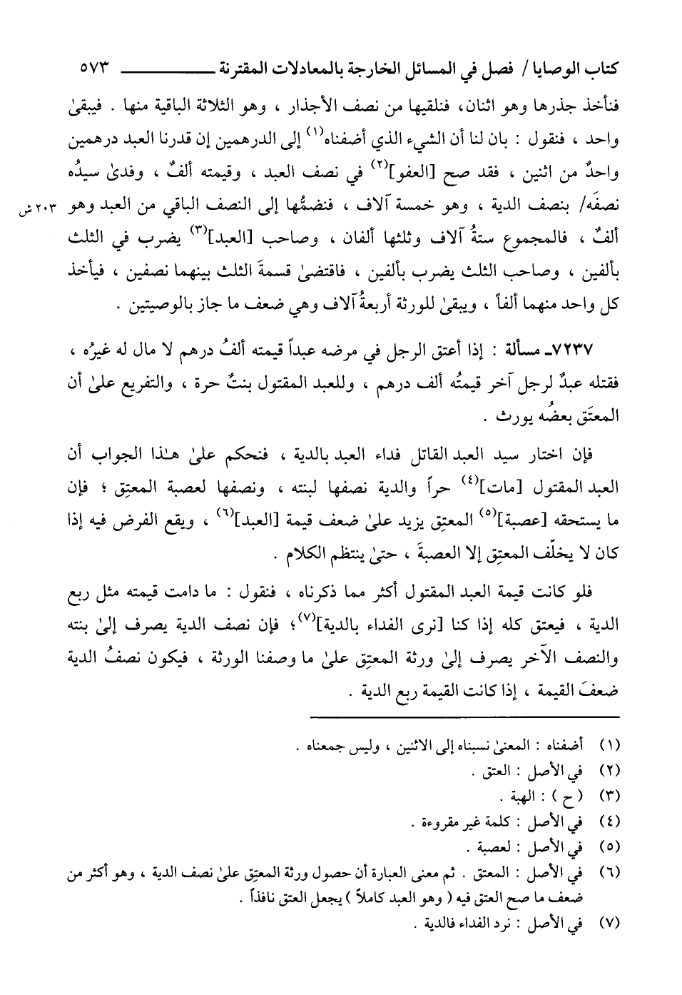 فنأخذ جذرها وهو اثنان، فنلقيها من نصف الأجذار، وهو الثلاثة الباقية منها. فيبقى واحد، فنقول: بان لنا أن الشيء الذي أضفناه (1) إلى الدرهمين إن قدرنا العبد درهمين واحدٌ من اثنين، فقد صح [العفو] (2) في نصف العبد، وقيمته ألفٌ، وفدى سيدُه نصفَه بنصف الدية، وهو خمسة آلاف، فنضمُّها إلى النصف الباقي من العبد وهو ألفٌ، فالمجموع ستةُ آلاف وثلثها ألفان، وصاحب [العبد] (3) يضرب في الثلث بألفين، وصاحب الثلث يضرب بألفين، فاقتضى قسمةَ الثلث بينهما نصفين، فيأخذ كل واحد منهما ألفاً، ويبقى للورثة أربعةُ آلاف وهي ضعف ما جاز بالوصيتين.