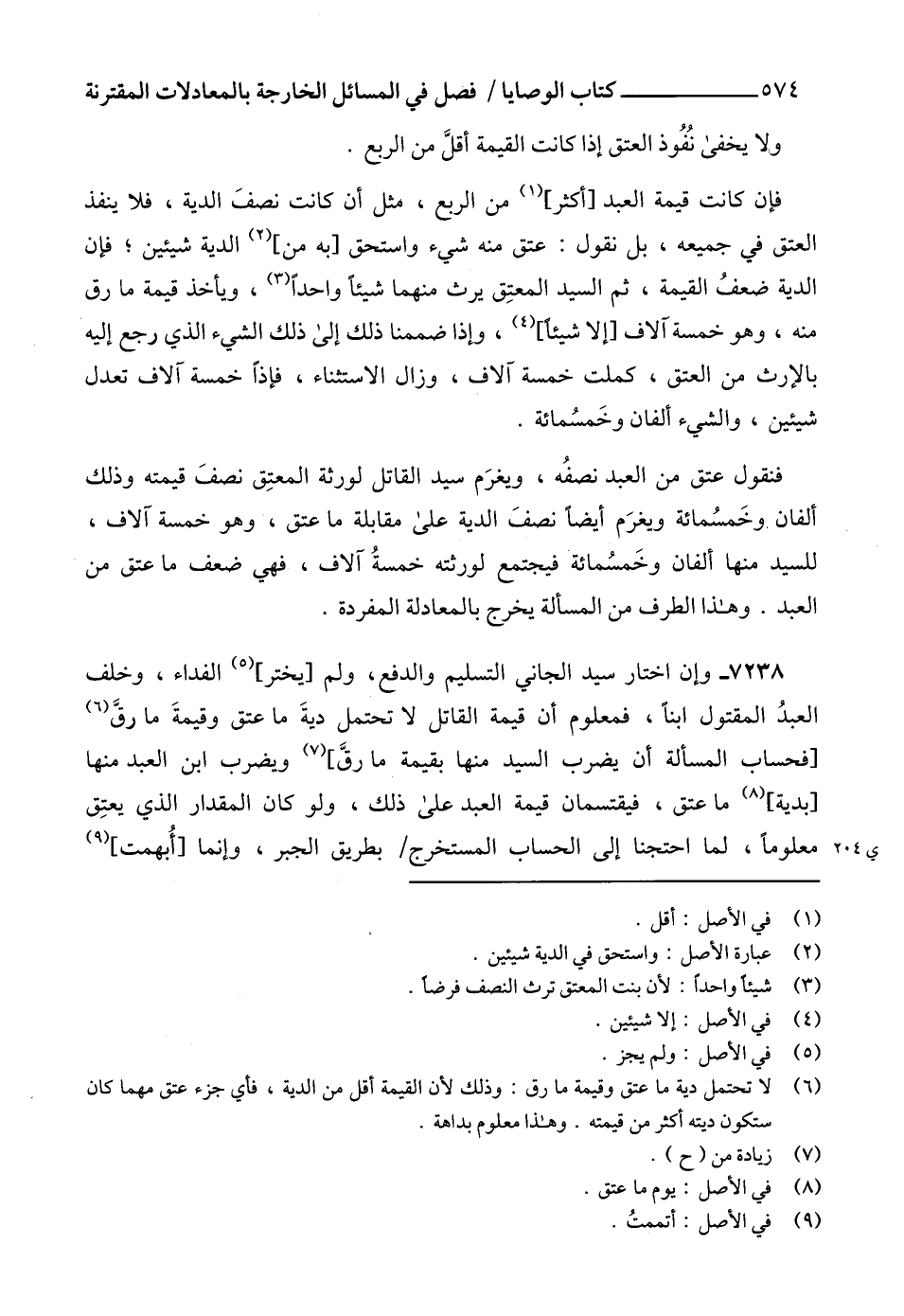 فنقول عتق من العبد نصفُه، ويغرَم سيد القاتل لورثة المعتِق نصفَ قيمته وذلك ألفان وخَمسُمائة ويغرَم أيضاً نصفَ الدية على مقابلة ما عتق، وهو خمسة آلاف، للسيد منها ألفان وخَمسُمائة فيجتمع لورثته خمسةُ آلاف، فهي ضعف ما عتق من العبد. وهذا الطرف من المسألة يخرج بالمعادلة المفردة.