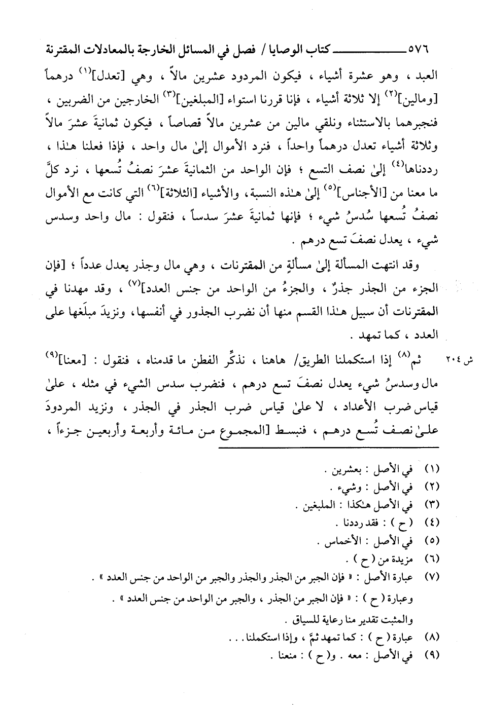 (7) عبارة الأصل: "فإن الجبر من الجذر والجذر والجبر من الواحد من جنس العدد". وعبارة (ح): "فإن الجبر من الجذر، والجبر من الواحد من جنس العدد".