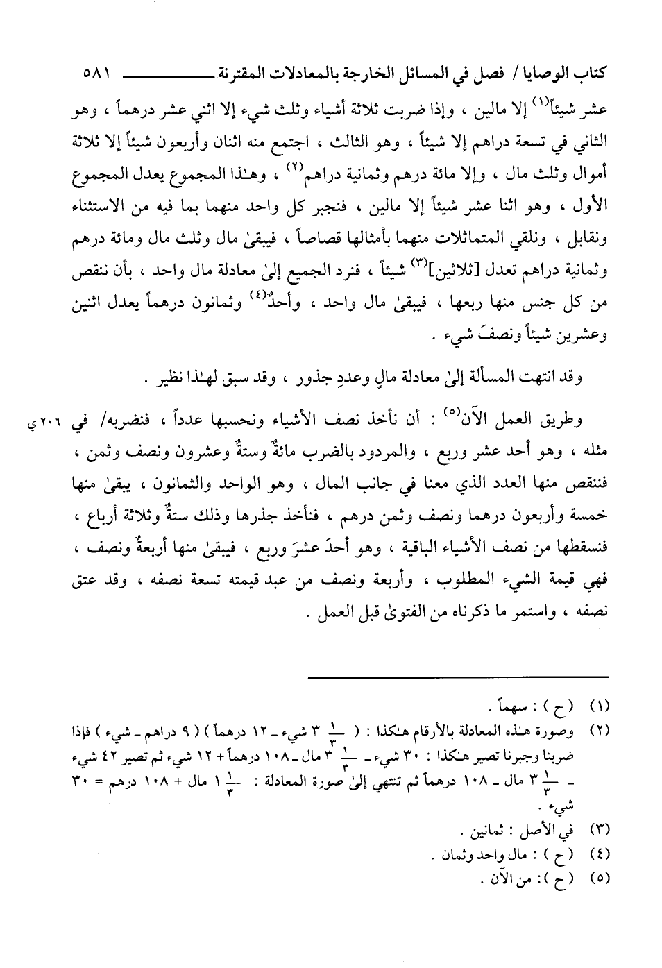 (2) وصورة هذه المعادلة بالأرقام هكذا: (1/ 3 3 شيء - 12 درهماً) (9 دراهم- شيء) فإذا ضربنا وجبرنا تصير هكذا: 30 شيء - 1/ 3 3 مال-108 درهماً + 12 شيء ثم تصير 42 شيء - 1/ 3 3 مال- 108 درهماً ثم تنتهي إلى صورة المعادلة: 1/ 3 1 مال+ 108 درهم= 30 شيء.