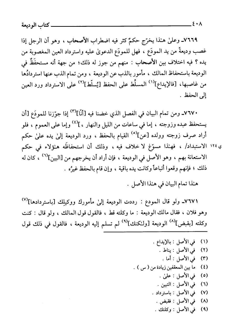 7671 - ولو قال المودع: رددت الوديعة إلى مأمورك ووكيلِك [باستردادها] (7) وهو فلان، فقال مالك الوديعة: ما وكلته قط، فالقول قول المالك، ولو قال: كنت وكلته [بقبض] (8) الوديعة [ولكنك] (9) لم تسلم إليه الوديعة، فالقول في ذلك قول