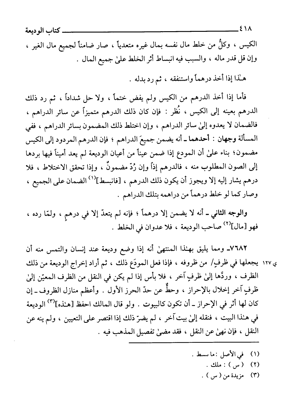 7682 - ومما يليق بهذا المنتهى أنه إذا وضع وديعة عند إنسان والتمس منه أن يجعلها في ظرفٍ من ظروفه، فإذا فعل المودَع ذلك، ثم أراد إخراج الوديعة من ذلك الظرف، وردَّها إلى ظرفٍ آخر، فلا بأس إذا لم يكن في النقل من الظرف المعيّن إلى ظرفٍ آخر إخلال بالإحراز، وحطٌّ عن حدّ الحرز الأول. وأعظم منازل الظروف -إن كان لها أثر في الإحراز- أن تكون كالبيوت. ولو قال المالك احفظ [هذه] (3) الوديعة في هذا البيت، فنقله إلى بيت آخر، لم يضرّ ذلك إذا اقتصر على التعيين، ولم ينه عن النقل، فإن نهى عن النقل، فقد مضى تفصيل المذهب فيه.