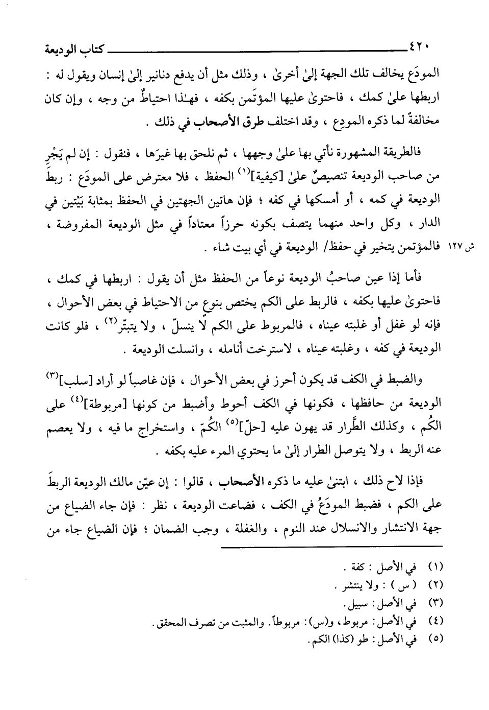 والضبط في الكف قد يكون أحرز في بعض الأحوال، فإن غاصباً لو أراد [سلب] (3) الوديعة من حافظها، فكونها في الكف أحوط وأضبط من كونها [مربوطة] (4) على الكُم، وكذلك الطَّرار قد يهون عليه [حلّ] (5) الكُمّ، واستخراج ما فيه، ولا يعصم عنه الربط، ولا يتوصل الطرار إلى ما يحتوي المرء عليه بكفه.