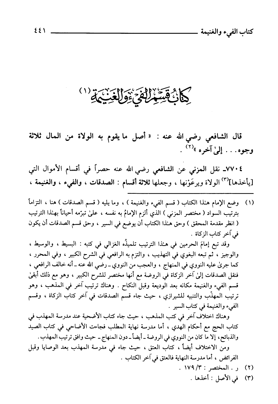 7704 - نقل المزني عن الشافعي رضي الله عنه حصراً في أقسام الأموال التي [يأخذها] (3) الولاة ويرعَوْنها، وجعلها ثلاثة أقسام: الصدقات، والفيء، والغنيمة،
