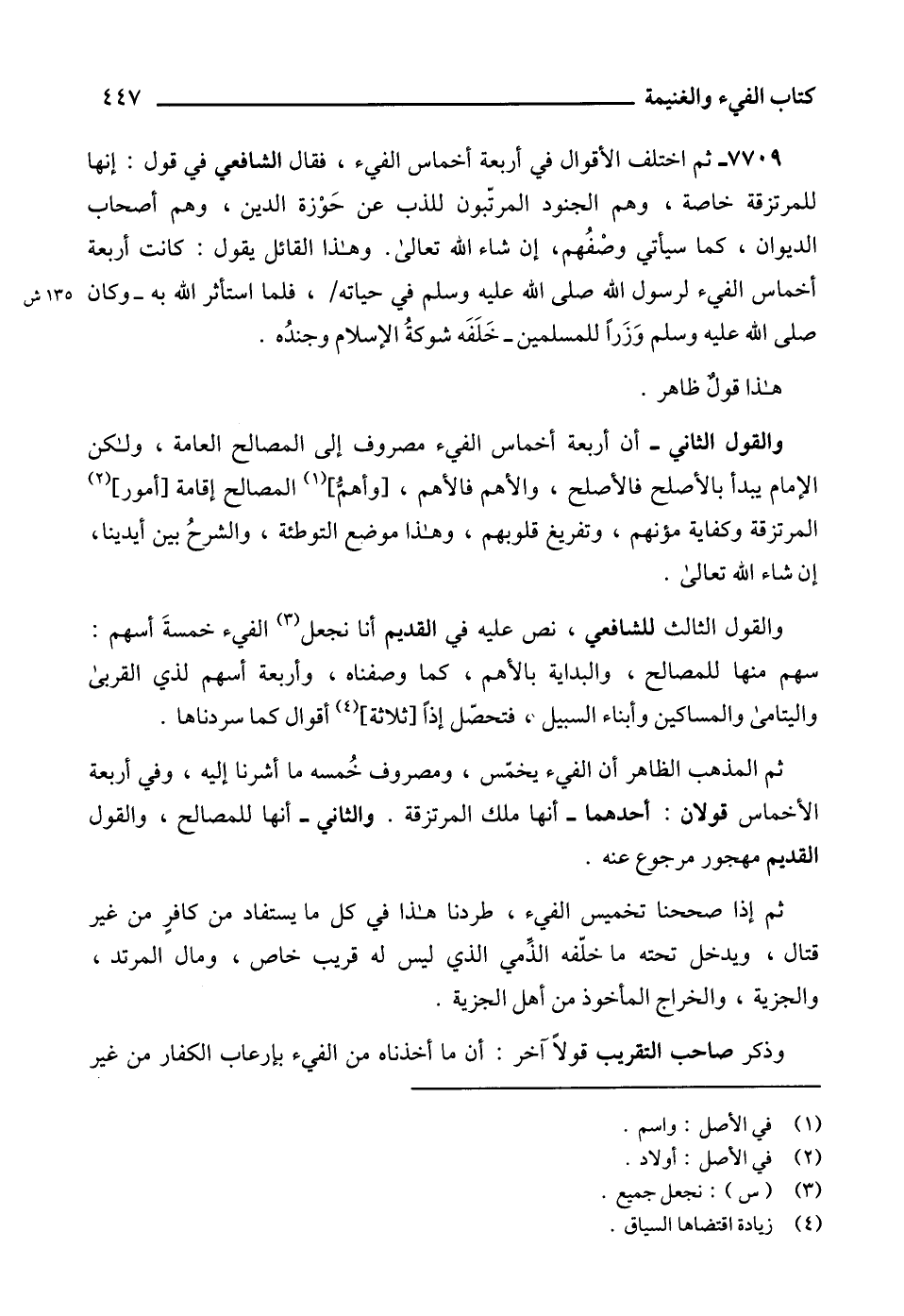 7709 - ثم اختلف الأقوال في أربعة أخماس الفيء، فقال الشافعي في قول: إنها للمرتزقة خاصة، وهم الجنود المرتّبون للذب عن حَوْزة الدين، وهم أصحاب الديوان، كما سيأتي وصْفُهم، إن شاء الله تعالى. وهذا القائل يقول: كانت أربعة أخماس الفيء لرسول الله صلى الله عليه وسلم في حياته، فلما استأثر الله به -وكان صلى الله عليه وسلم وَزَراً للمسلمين- خَلَفَه شوكةُ الإسلام وجندُه.