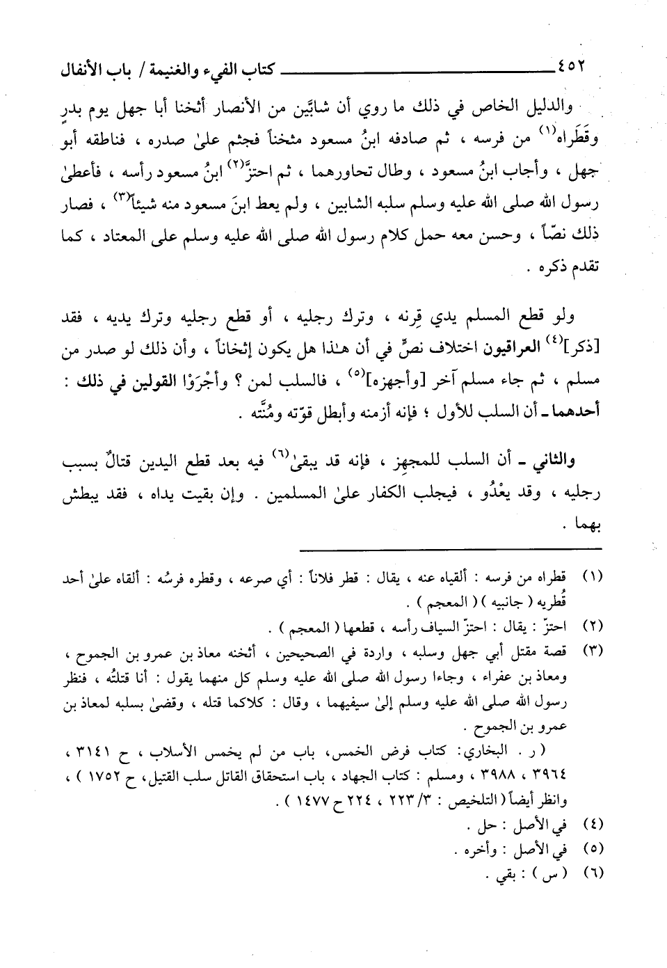 (ر. البخاري: كتاب فرض الخمس، باب من لم يخمس الأسلاب، ح 3141، 3964، 3988، ومسلم: كتاب الجهاد، باب استحقاق القاتل سلب القتيل، ح 1752)، وانظر أيضاً (التلخيص: 3/ 223، 224 ح 1477).