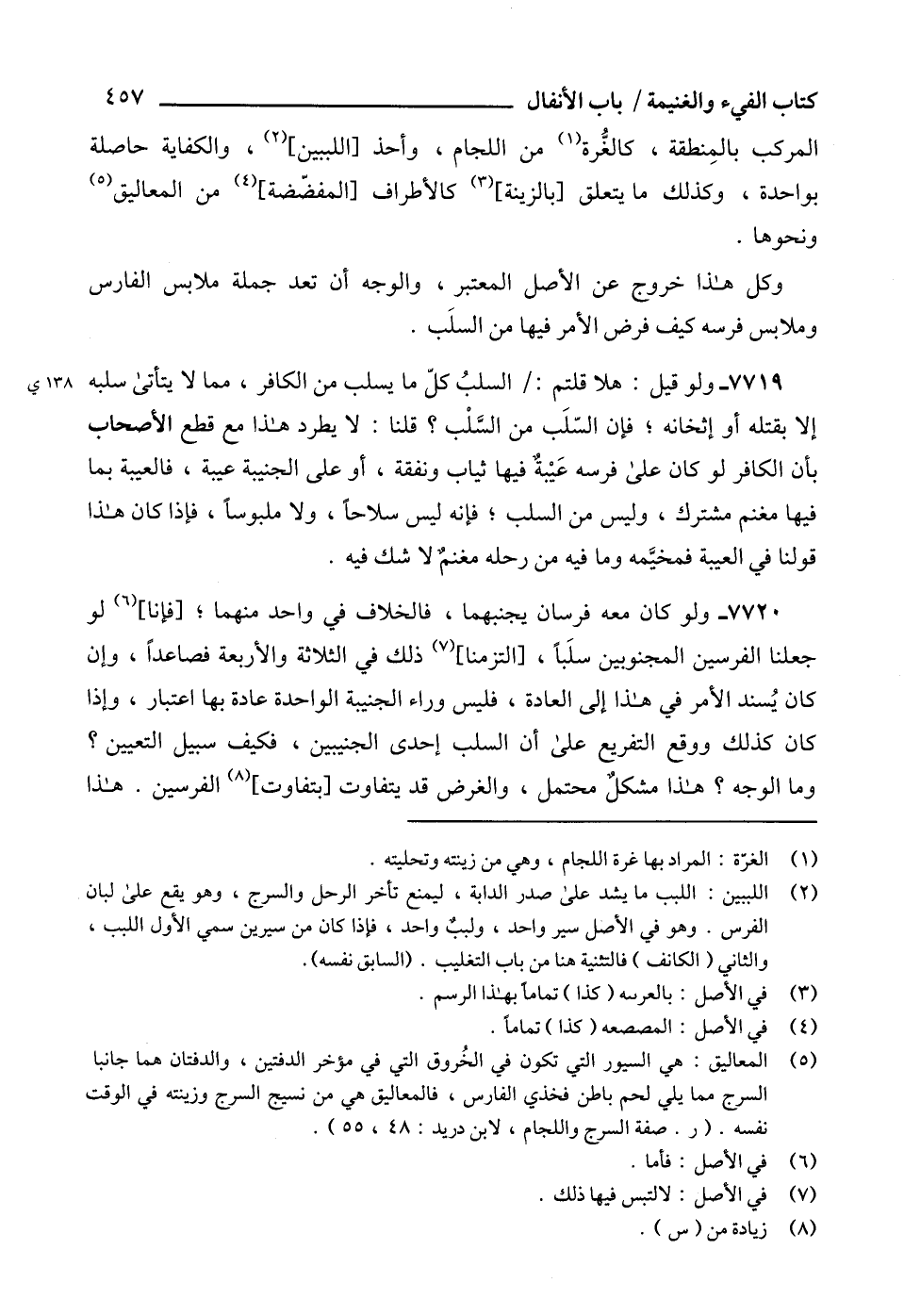 7720 - ولو كان معه فرسان يجنبهما، فالخلاف في واحد منهما؛ [فإنا] (6) لو جعلنا الفرسين المجنوبين سلَباً، [التزمنا] (7) ذلك في الثلاثة والأربعة فصاعداً، وإن كان يُسند الأمر في هذا إلى العادة، فليس وراء الجنيبة الواحدة عادة بها اعتبار، وإذا كان كذلك ووقع التفريع على أن السلب إحدى الجنيبين، فكيف سبيل التعيين؟