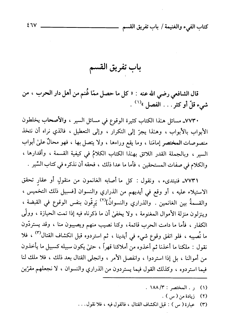 7730 - مسائل هذا الكتاب كثيرة الوقوع في مسائل السير، والأصحاب يخلطون الأبواب بالأبواب، وهذا يجرّ إلى التكرار، وإلى التعطيل، فالذي نراه أن نتخذ منصوصات المختصر إمامَنا، وما يقع وراءها، ولا يتصل بها، فهو محالٌ على أبواب السير، وبالجملة القدر اللائق بهذا الكتاب الكلامُ في كيفية القسمة، وأقدارها، والكلام في صفات المستحقين، فأما ما عدا ذلك، فحقه أن نذكره في كتاب السِّير.